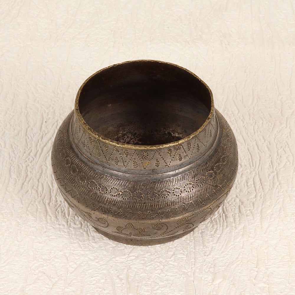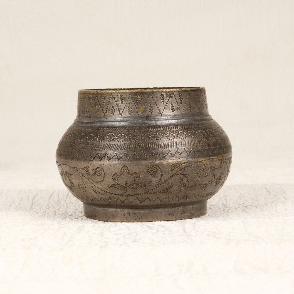 A Vintage Brass Holy Water Pot that is a testament to the artistry of highly skilled Indian artisans. Handcrafted from high-quality brass, this sacred vessel boasts intricate needle engravings, adding a touch of timeless elegance to your prayer, rituals, and havans. The antique grey finish enhances its vintage allure, making it a captivating addition to any home, office, restaurant, hotel, or café prayer room. This meticulously crafted holy water pot serves as a symbol of devotion, blending functionality with aesthetic appeal. Its versatility extends beyond religious practices, as it doubles as a charming decor piece that effortlessly complements various settings. Embrace its historical charm by incorporating it into your vintage collection, creating a curated display that reflects both spirituality and artistry. Share the blessings by presenting this handmade masterpiece to your loved ones on special, festive, or auspicious occasions.