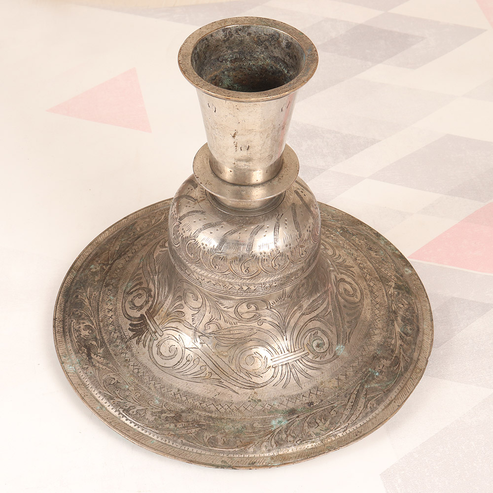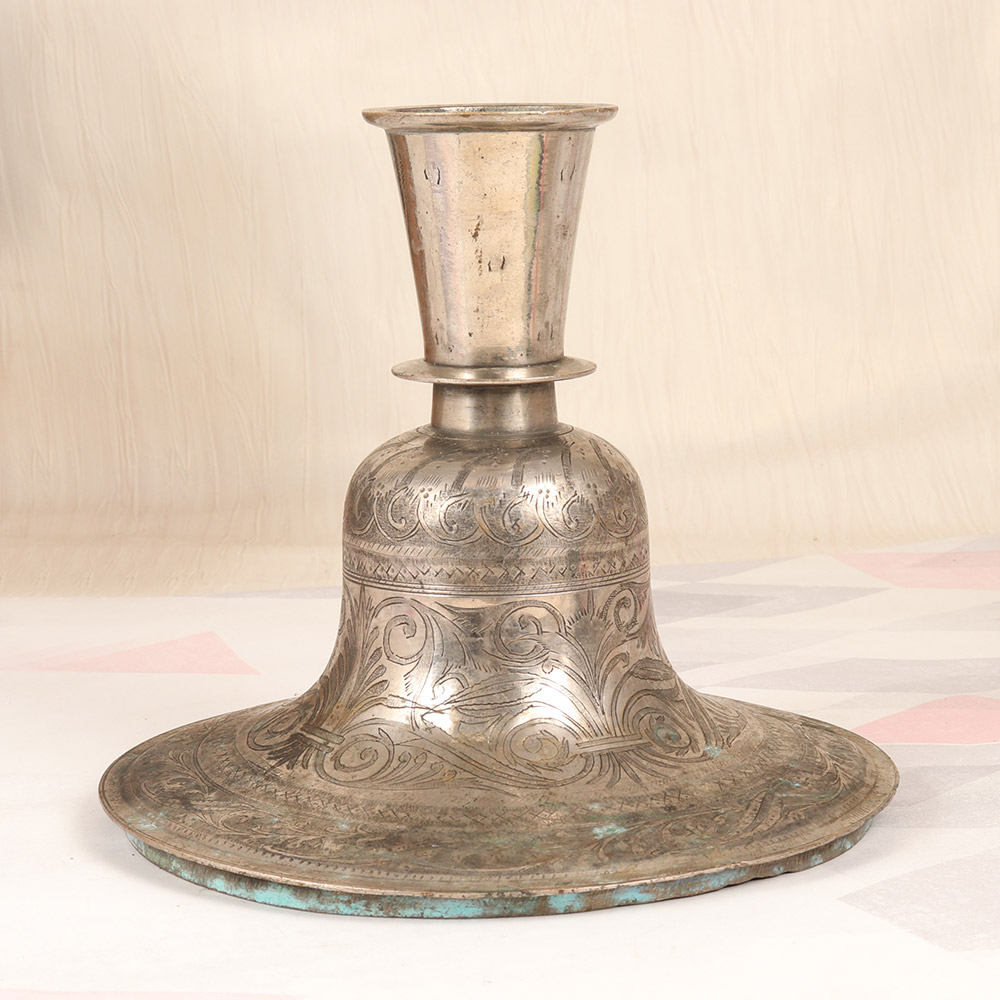 Elevate your hookah experience with this stunning, vintage brass hookah base from Hyderabad. Meticulously crafted with intricate carvings and a sleek grey finish, this piece is a true work of art that will transform your smoking ritual into a sophisticated, sensory delight. This vintage brass hookah base is more than just a functional smoking accessory - it's a testament to the rich artisanal heritage of Hyderabad. Each piece is uniquely shaped and finished by skilled local craftsmen, ensuring no two are exactly alike. Whether you're a seasoned hookah enthusiast or new to the ritual, this base will elevate your experience and leave a lasting impression on your guests. Imagine gathering friends around the warm glow of this stunning hookah, the fragrant smoke swirling through the air as you all savor the moment. The vintage brass base will become the centerpiece of your space, sparking conversation and creating an atmosphere of relaxation and sophistication. Upgrade your hookah game and treat yourself to this exceptional piece of Hyderabadi craftsmanship.