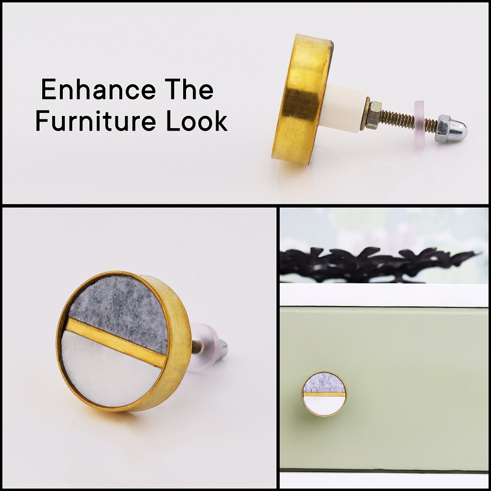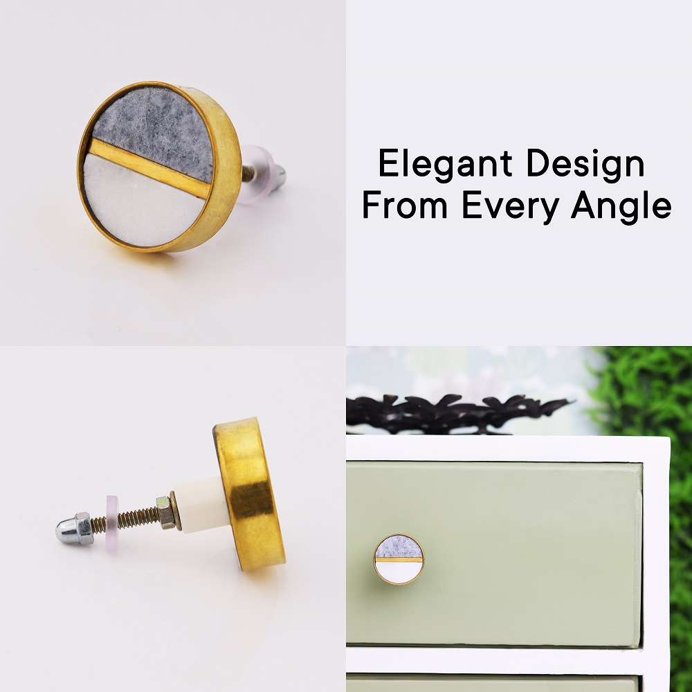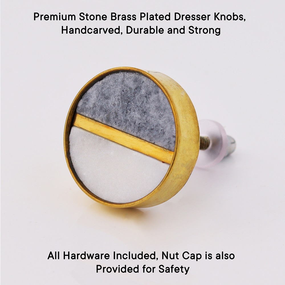 Crafted from high-quality grey and white stone, these knobs are both durable and stylish. The brass plating provides a refined finish, ensuring that the knobs remain beautiful and sturdy for years to come. Their smooth, polished surface offers a comfortable grip, while the sturdy brass base guarantees secure attachment.