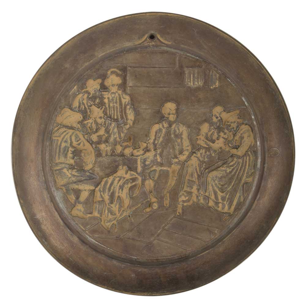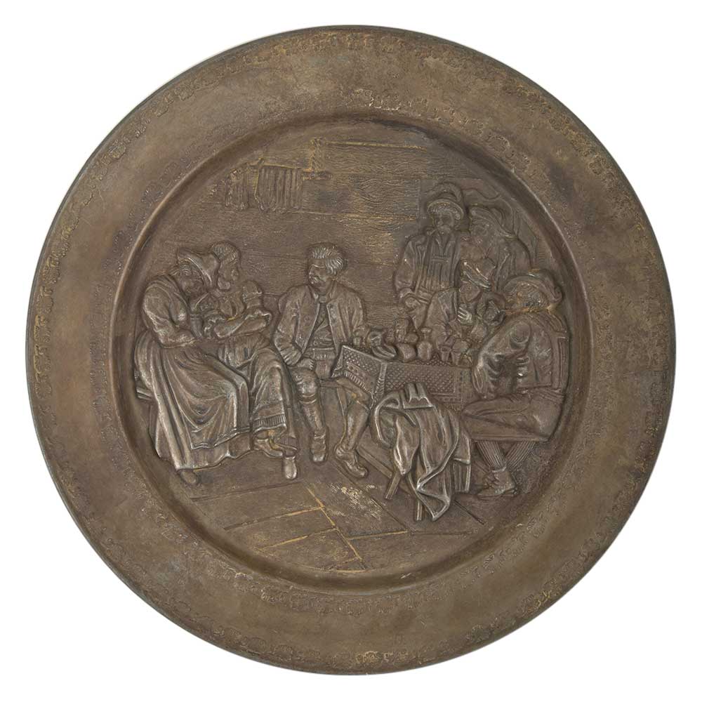 Vintage Embossed Plate / Wall Hanging Featuring English Pub Scene. Hand Hammered or Embossed Bronze Serving Tray or Plate has a Common Pub Scene Where the Men are Seen Drinking Liquor Where on the Other Side are Seated Two Ladies While One Seems to Be Tired and the Other is Talking to One of the Men. a Nice Wall Decoration and Gifting Item.