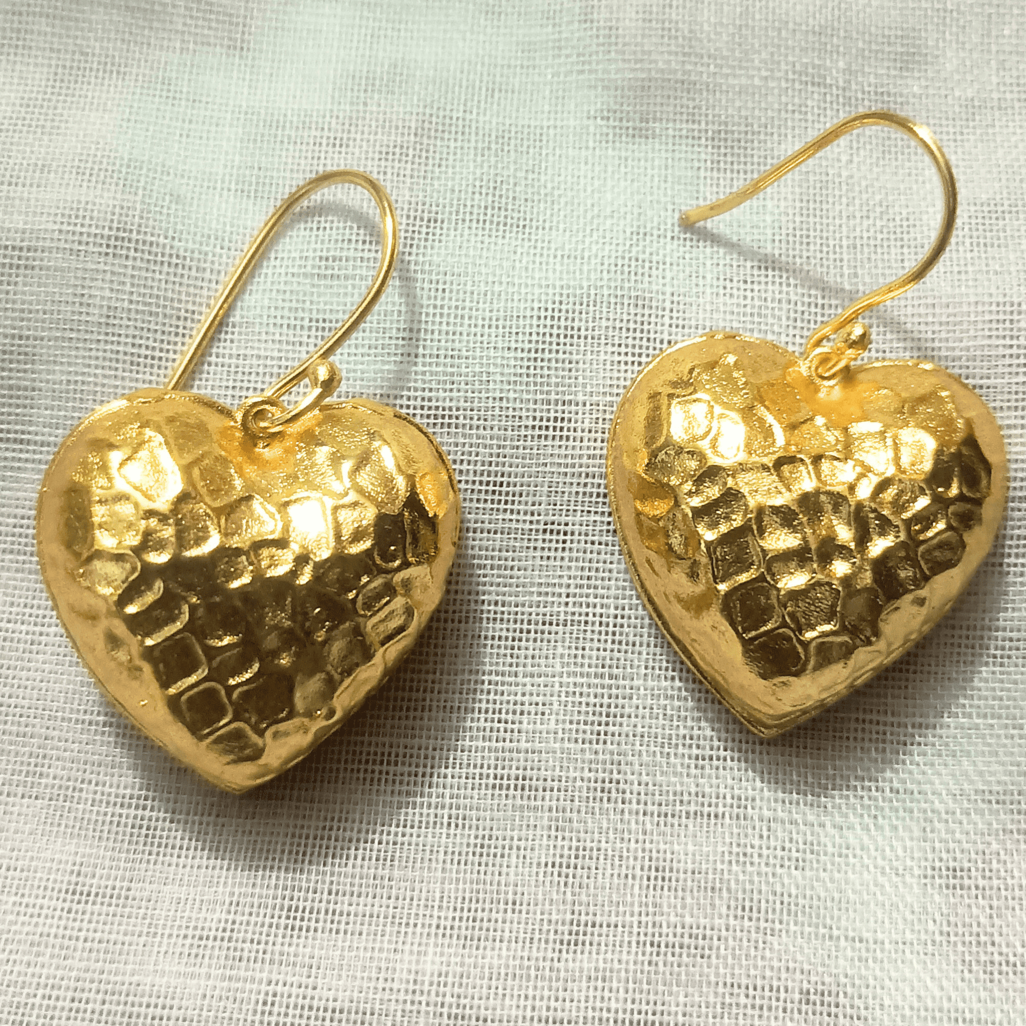 These Hammered Heart Dangle Earrings blend rustic artistry with contemporary charm. Handcrafted from premium brass and coated in radiant gold plating, each earring features a heart-shaped silhouette with a beautifully hand-hammered texture that glows with artisan detail. Lightweight yet expressive, these earrings bring emotional warmth and refined craftsmanship to every outfit—perfect for those who value jewelry with a story.