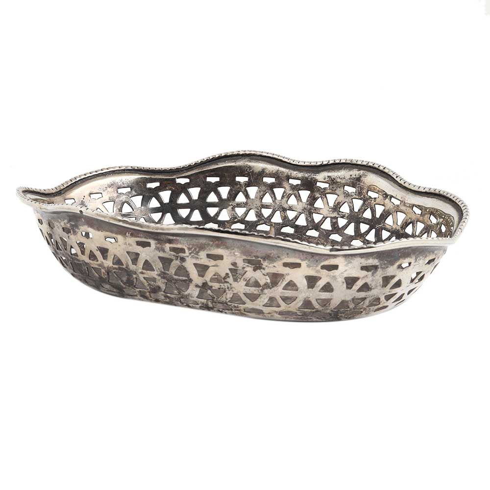A hand-carved oval shaped brass serving bowl with an antique silver finish is perfect for occasional gifts or festive decorations.