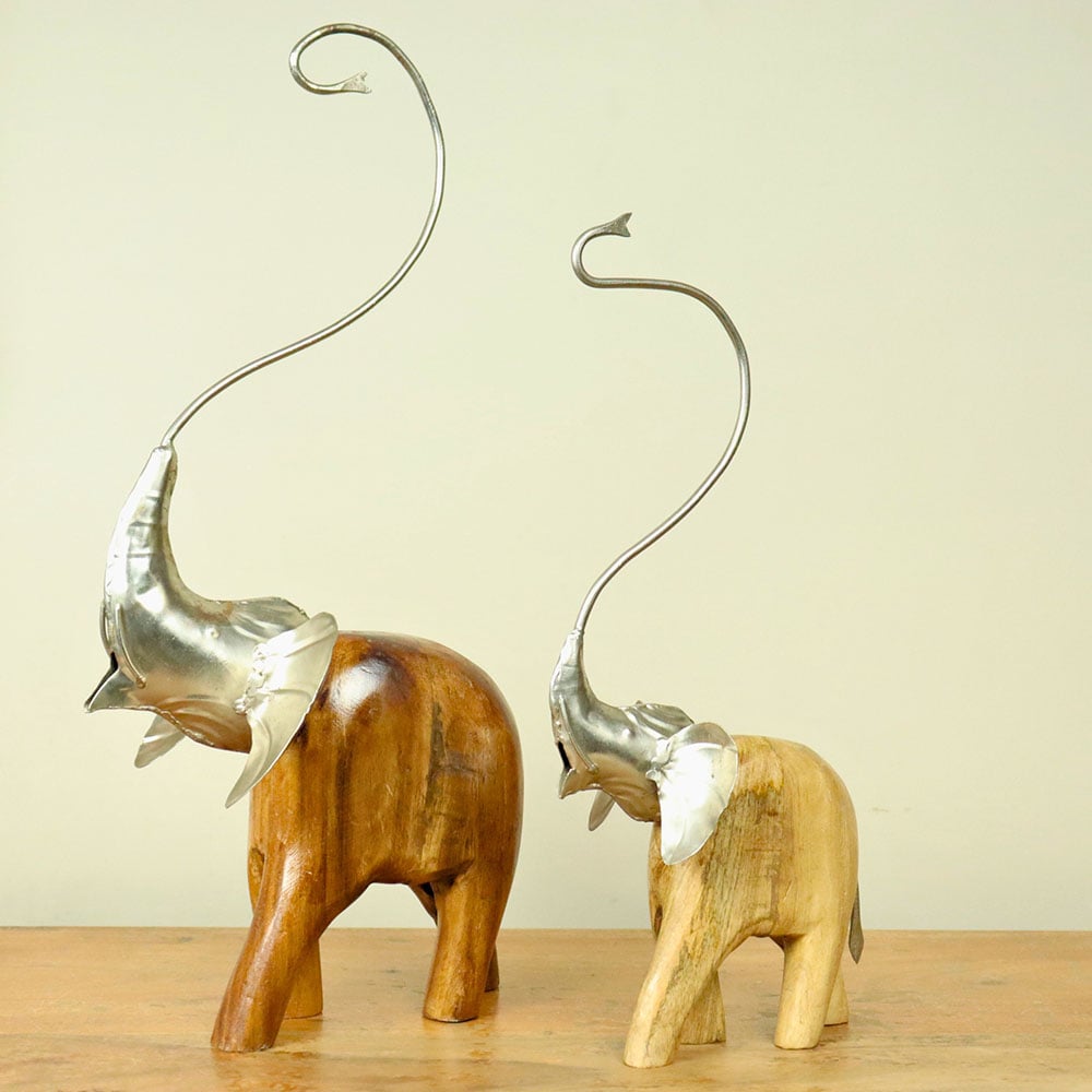 • Light and dark wood bodies with metal heads, trunks, and ears