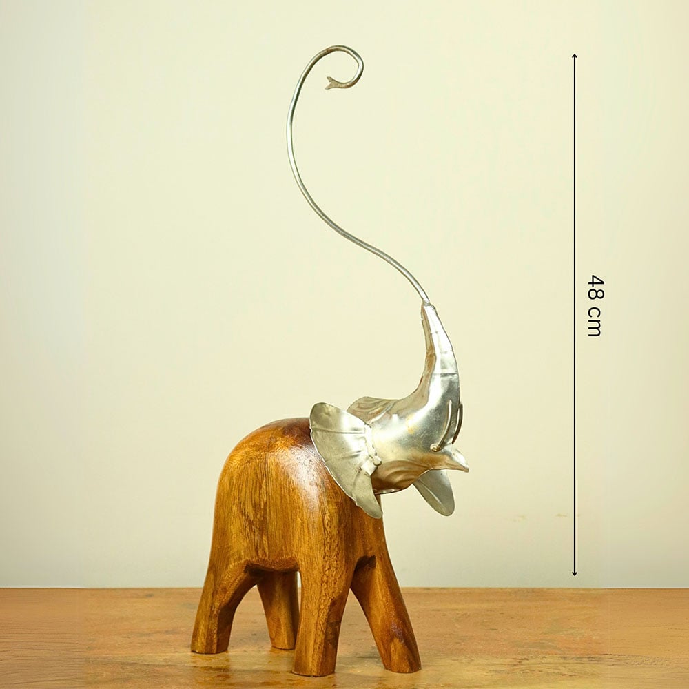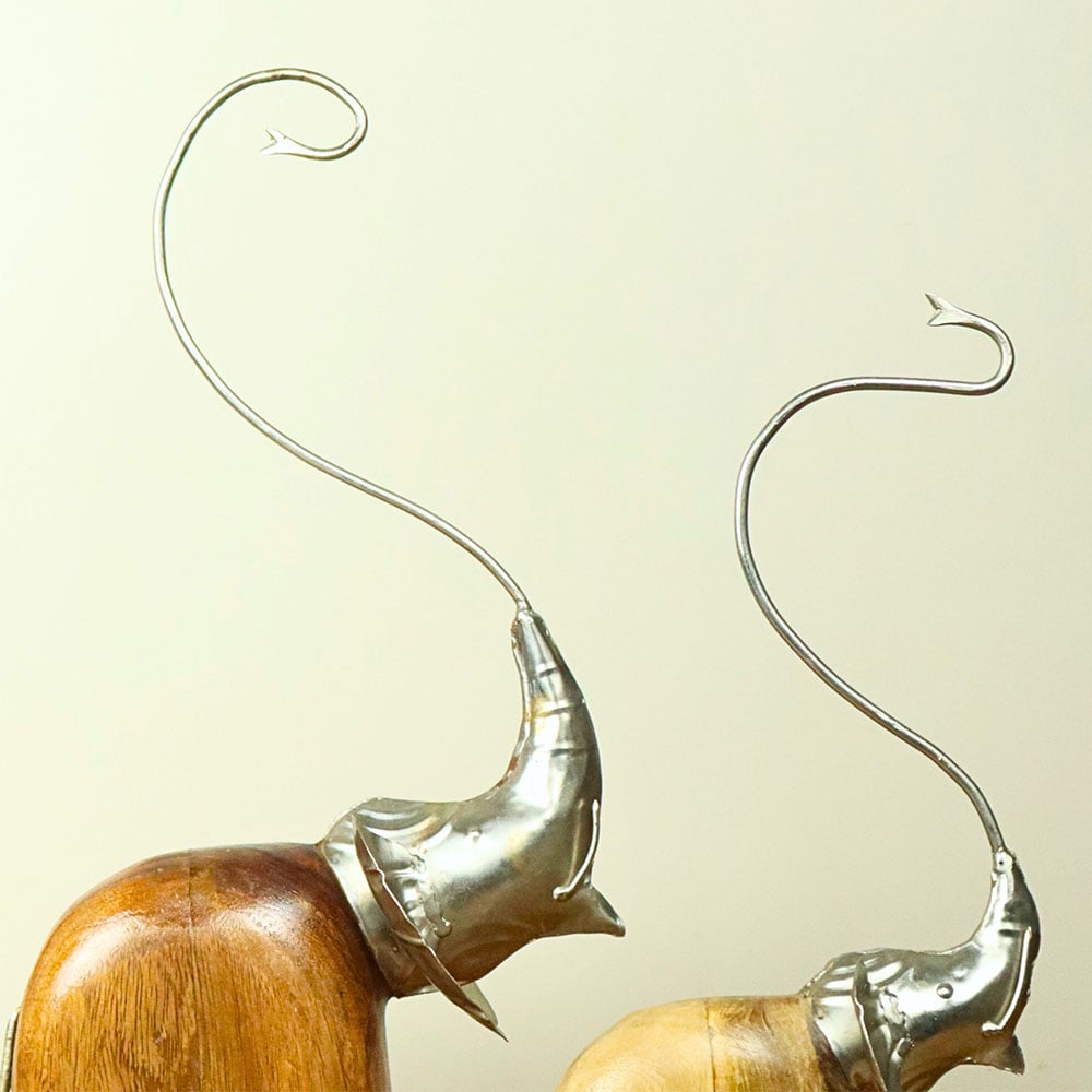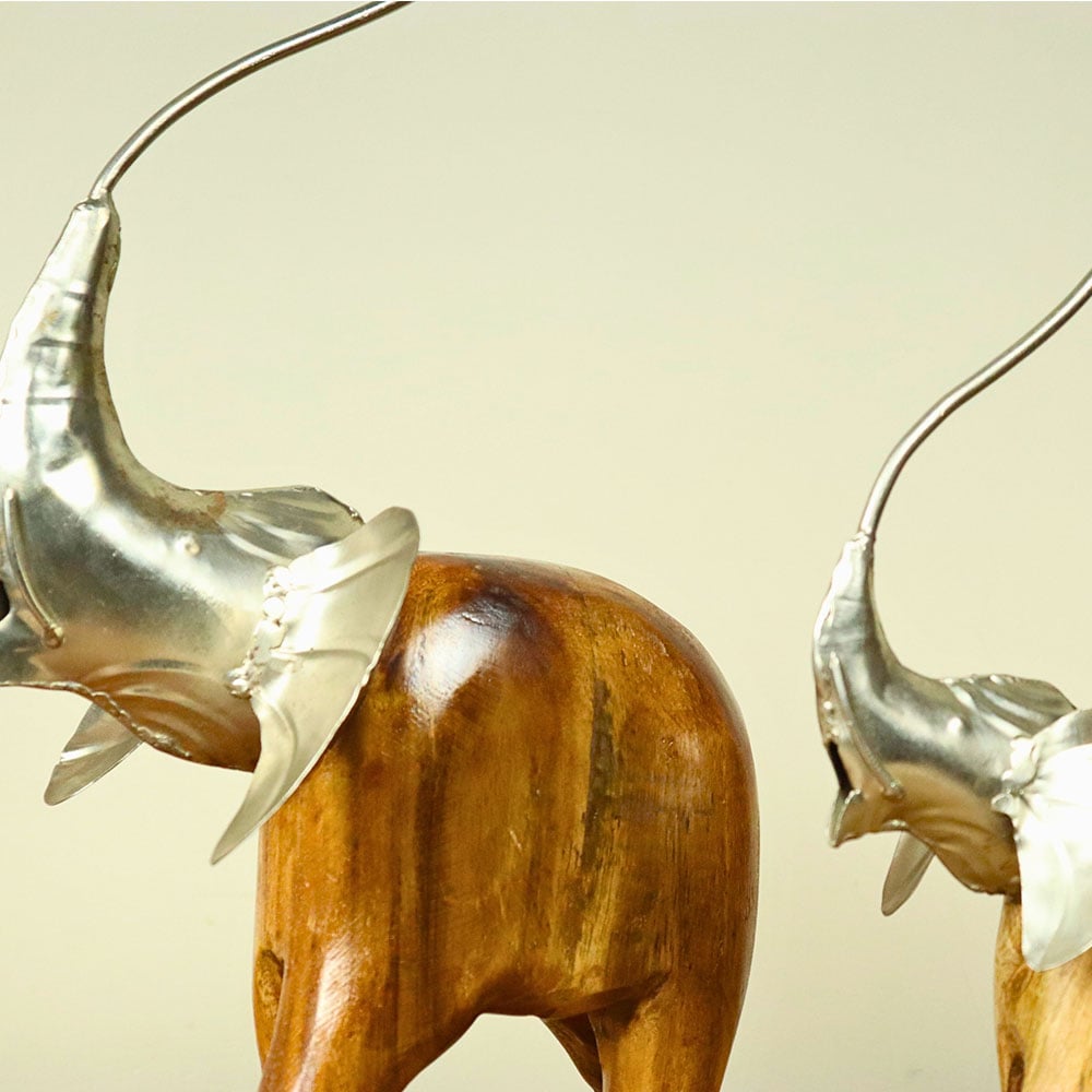This duo of wooden elephant figurines celebrates boho artistry through sustainable wood bodies and intricately sculpted metal heads, trunks, and ears. Their natural hand-polished finishes, one light and one dark, create visual harmony and depth. Ideal for home decorators, gift-givers, and elephant enthusiasts seeking organic elegance. Packed & quality-checked by Indianshelf.