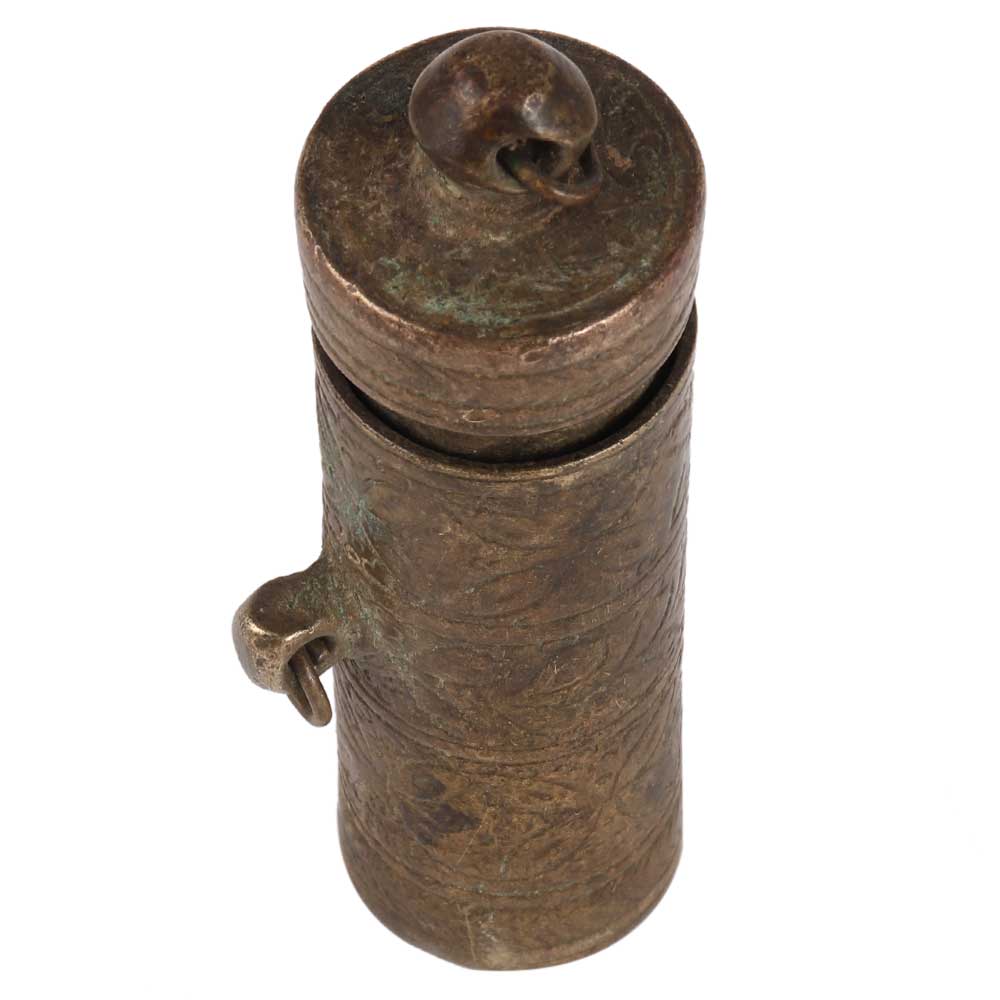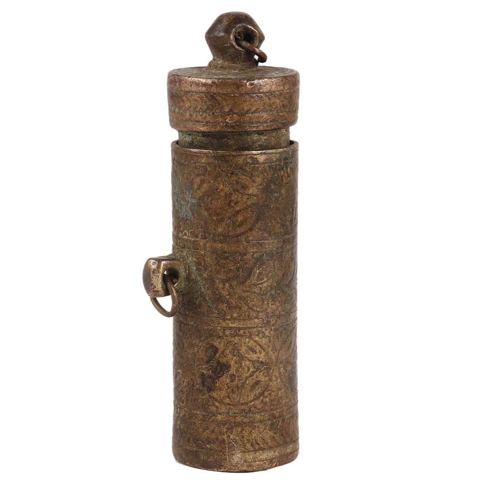 Old brass chuna dani or lime paste container, handcrafted by indian artisans using traditional design and methods.  Eating pan is an ancient Indian tradition in which lime paste is applied to betel laves to produce a slight intoxicated sensation. Give it to your family members and friends.