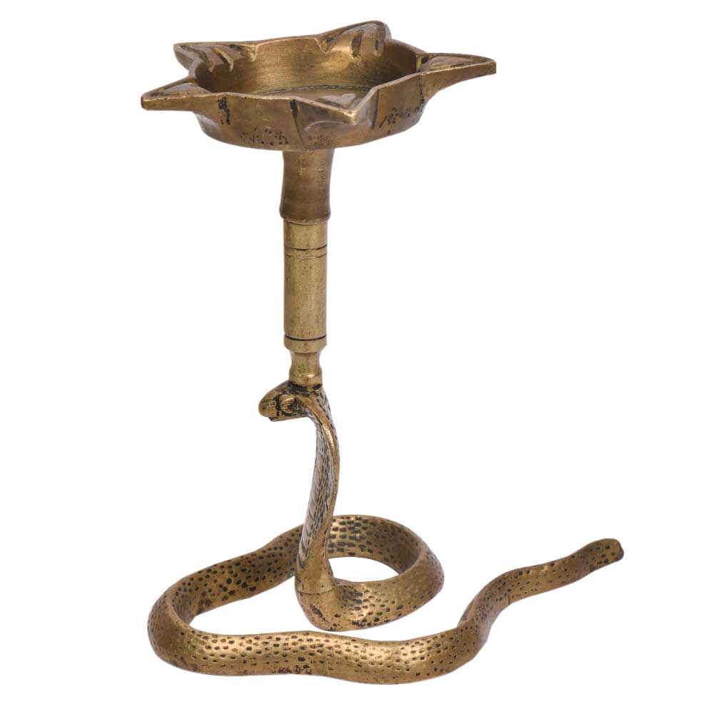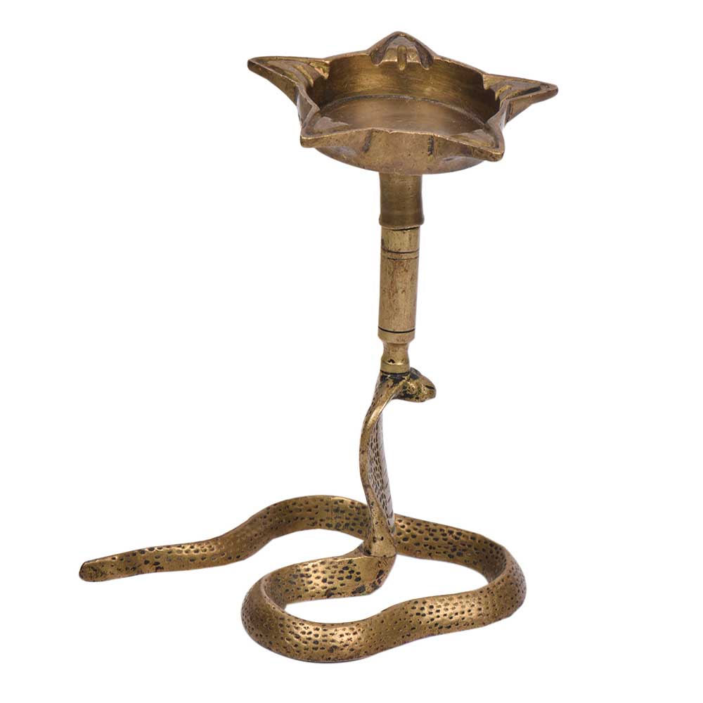 A very Unique looking brass oil lamp on the hood of snake cobra this Beautifully Shaped Vintage Oil Diya is Known as cobra hood Diya or oil lamp. This Can Be Observed by the Design, the Symbols and the Figures Sculptured on This Lamp. It Adds Spiritual Flavor to Your Decor.
