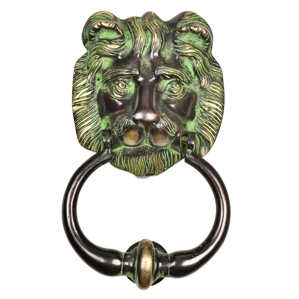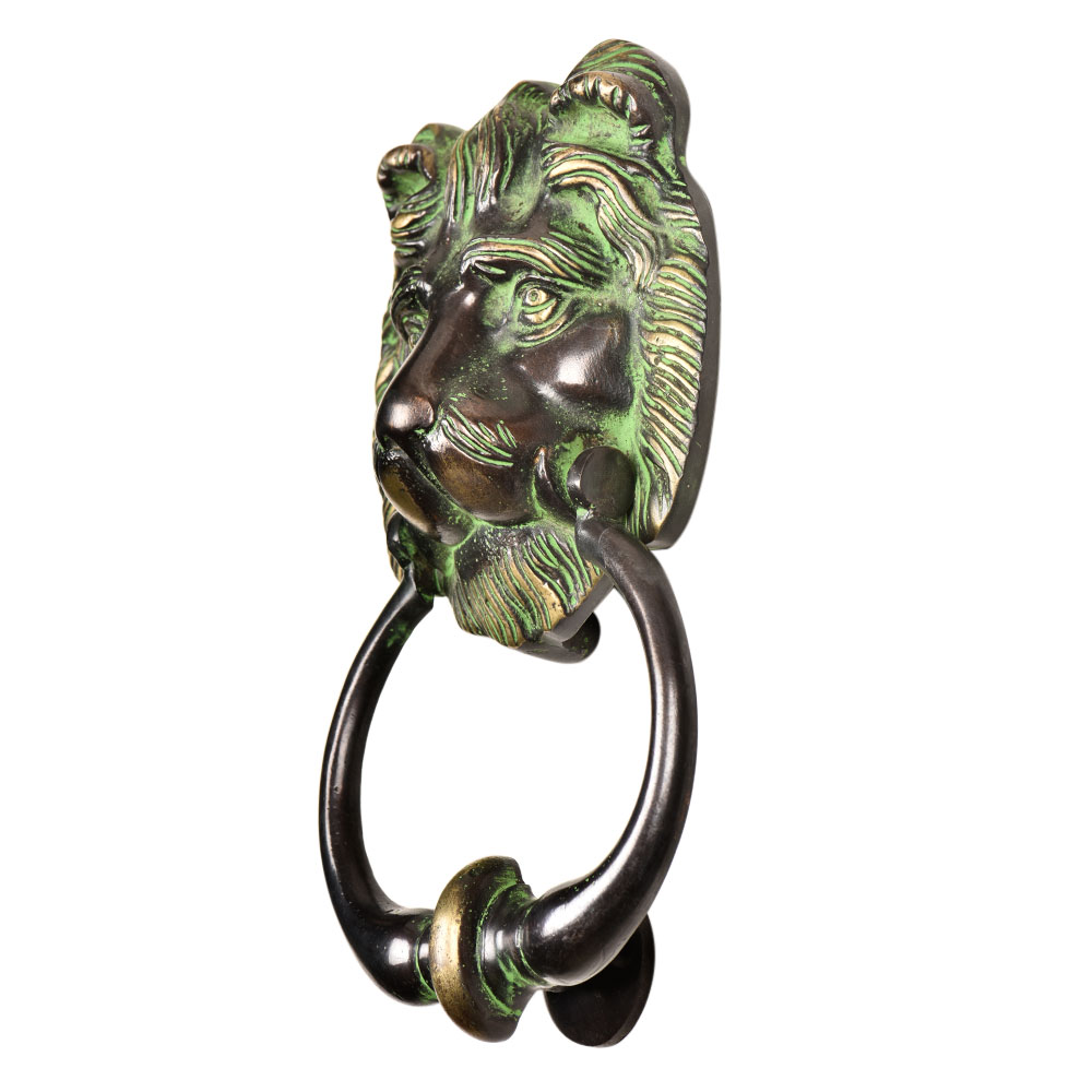 Bring the inviting warmth of nature to your front door with the addition of the lion Head door knocker. Made of solid brass, this door knocker includes matching mounting hardware and striking plate. Lion door knockers is an ideal decorative accent for a front entryway and is a great way for stylishly announcing a visitor.Comes with a rich patina.