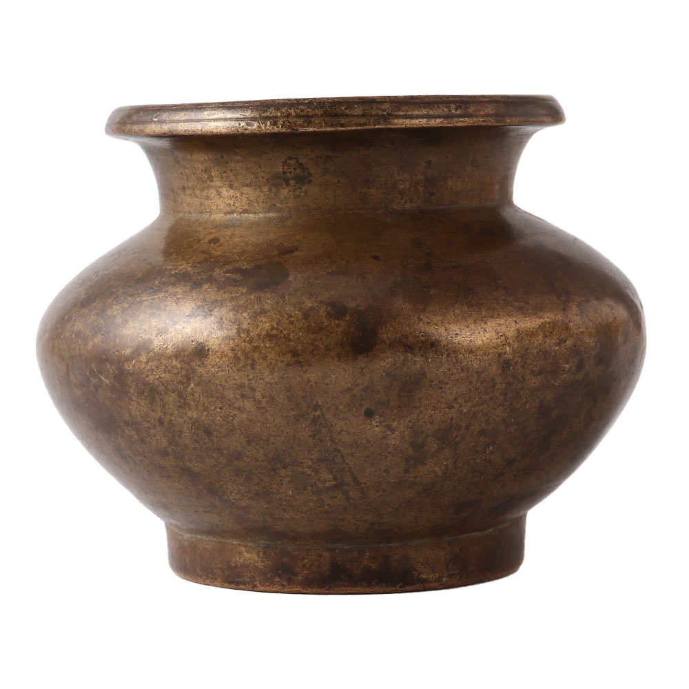 An antique brass water pot used in Hindu religion. It is ornamental with a classic round pot shape and was likely constructed as a lota or water carrying vessel. This is a wonderful artwork to exhibit and will appeal to fans of vintage art.
