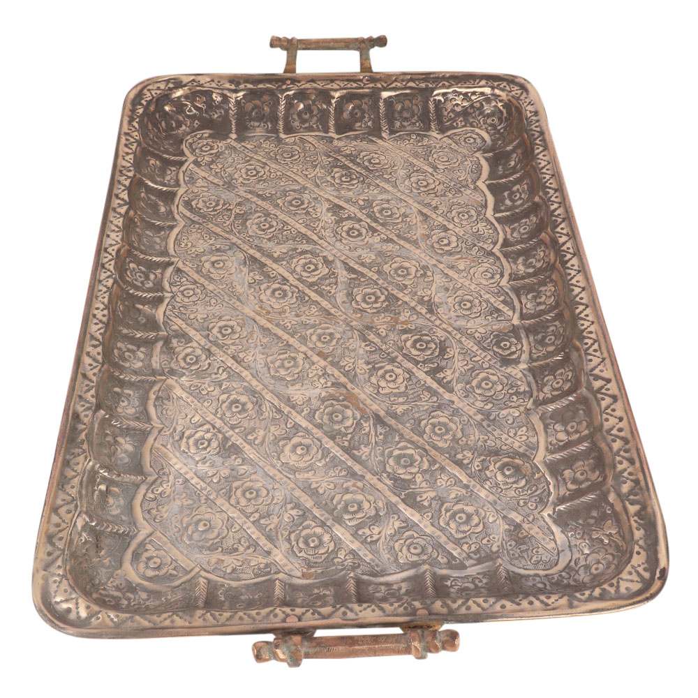 Hand etched Turkish copper tray with floral pattern in the centre with brownish red finish. This item's craftsmanship is fantastic, with great designing and decorative rectangular edges. It can be used as a display piece, a serving tray, or even a wall hanging.