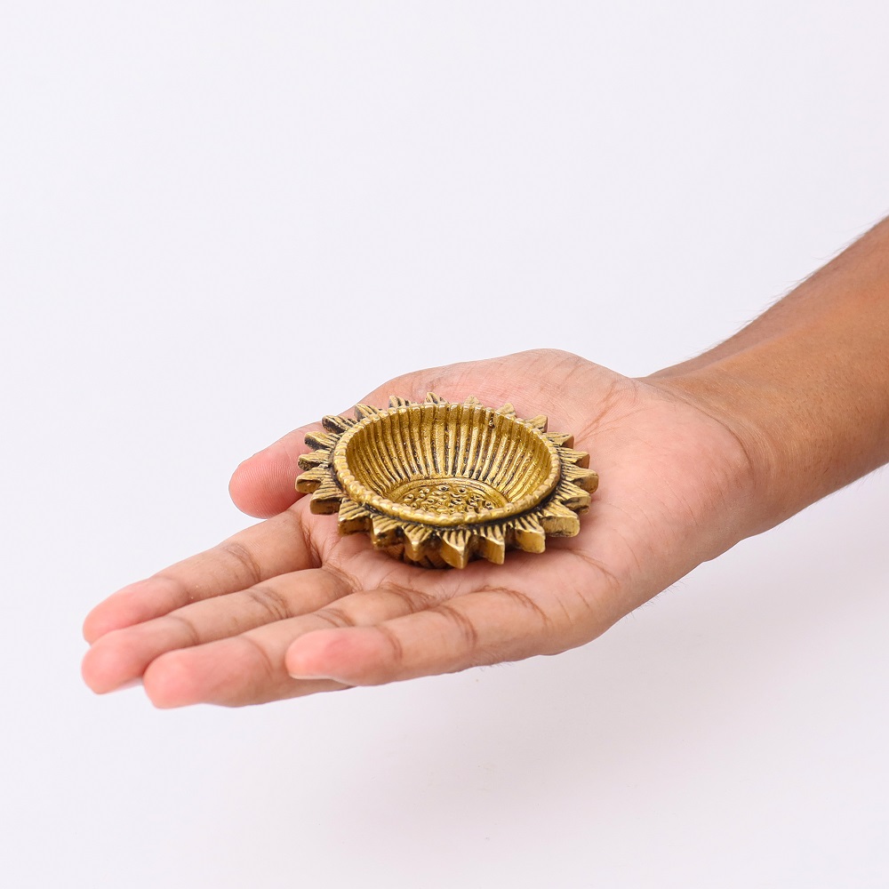 Indianshelf.com for bulk/wholesale orders.Indianshelf.us for personal purchases.Bring the brilliance of tradition into your home with the Handcrafted Sunflower Brass Oil Lamp, a diya inspired by the radiance of the sun. The sunflower motif symbolizes positivity, devotion, and divine energy, while the golden brass finish adds warmth and charm. Compact yet eye-catching, it’s ideal for puja rituals, rangoli arrangements, and festive lighting.