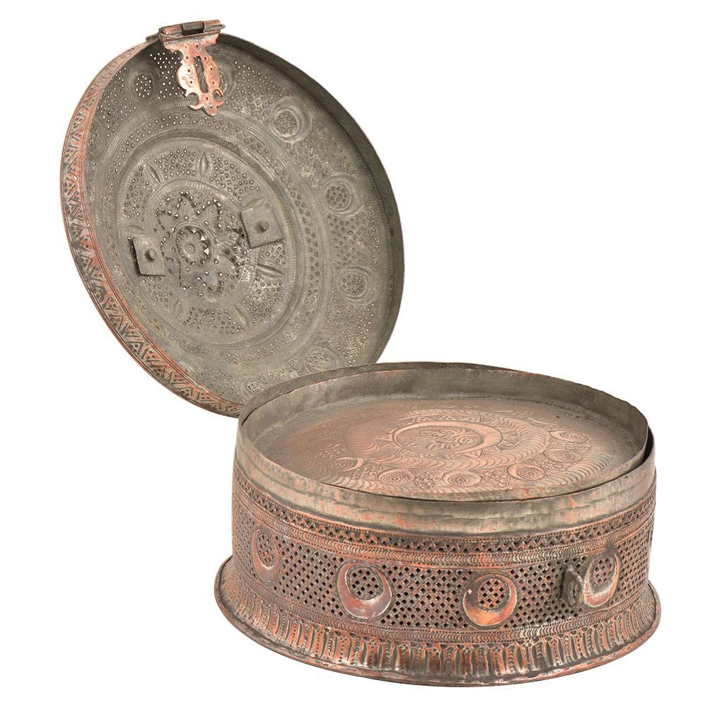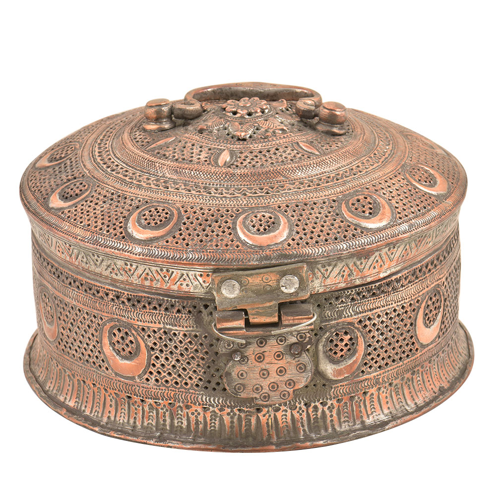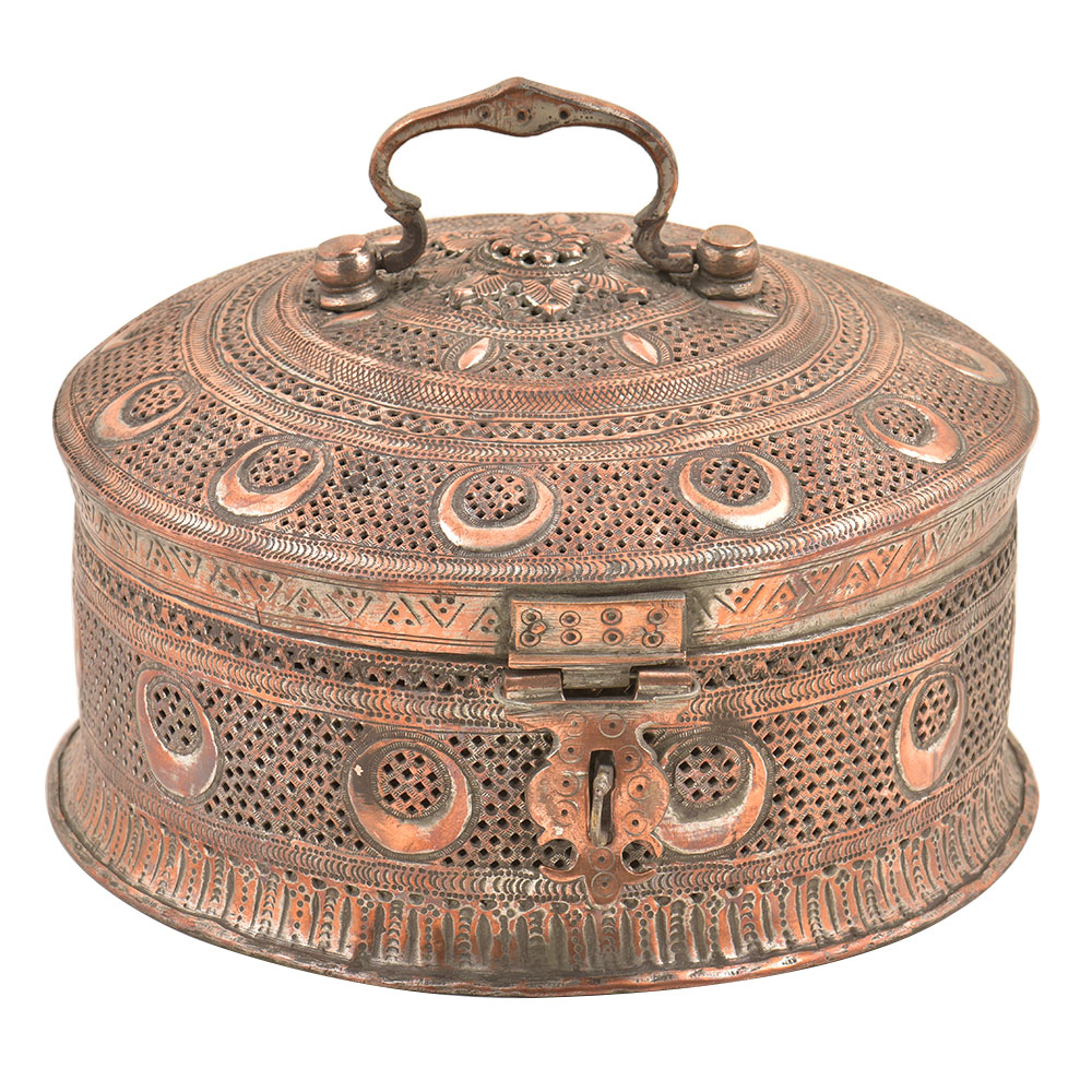 Hand Embossed Copper Betel Nut Pandan Box – with hand hammered circular jali and incised decoration used to store betel leaf, lime, tobacco and the nut from the areca palm. The practice of chewing betel nut was popular all over Asia and is still a common practice in Myanmar and India. This Pandan betel nut box contains six small pots, each incised on the tops and sides with the same design and metal.