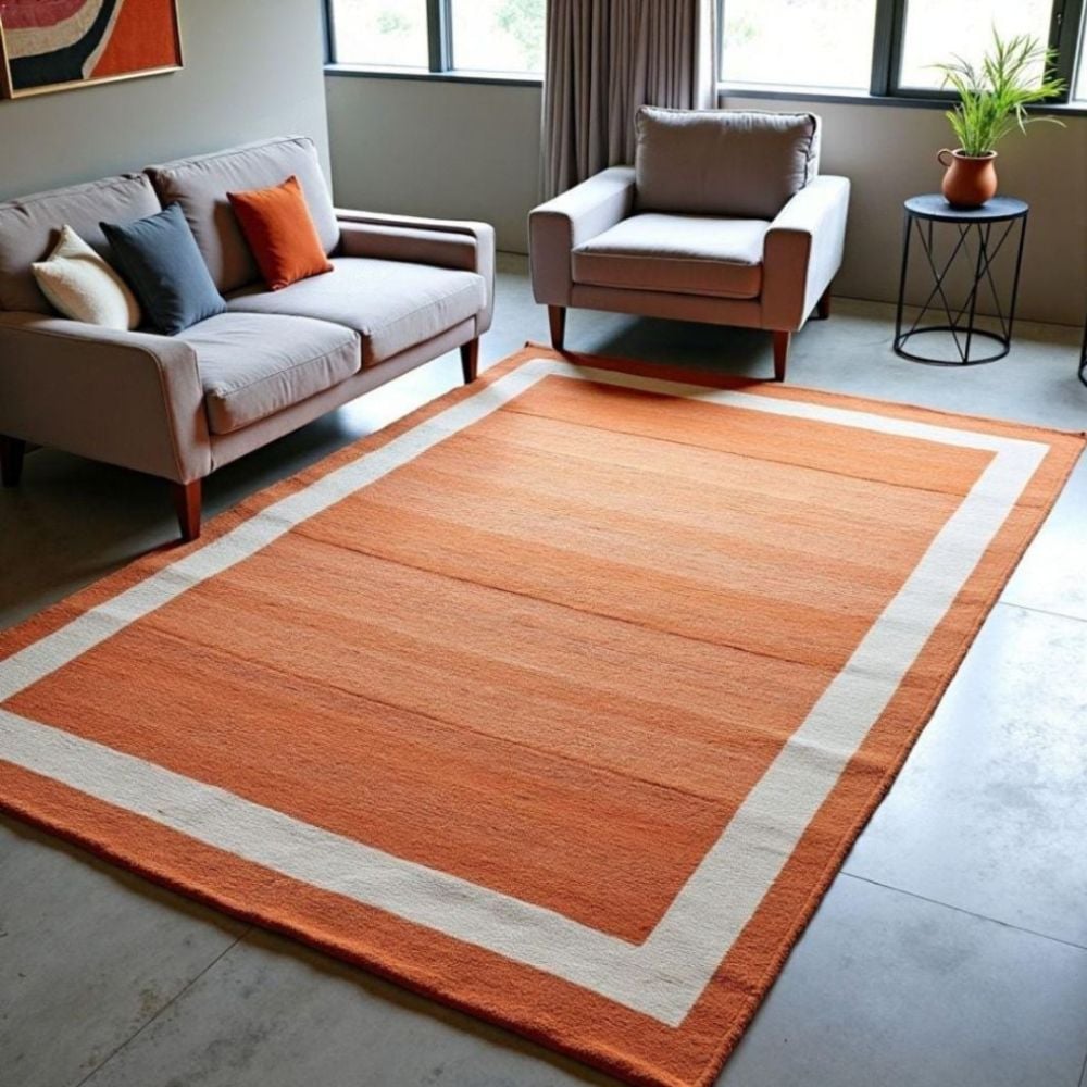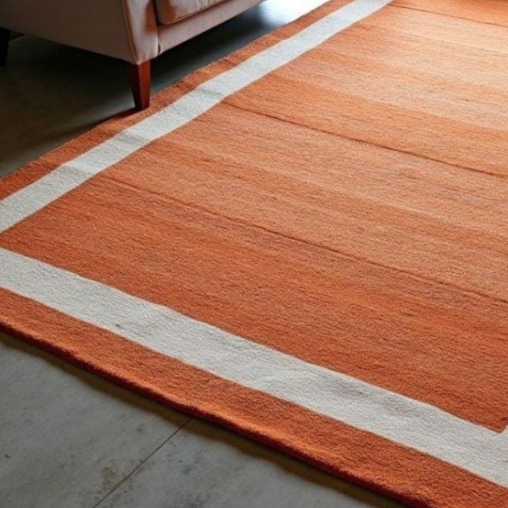Elevate your space with the clean elegance of this hand knotted minimalist wool rug, featuring a bold solid orange field framed by a crisp ivory border. This simple yet striking design offers timeless versatility, making it an ideal choice for both modern and transitional interiors. Expertly crafted by skilled artisans using 100% premium wool, this rug is luxuriously soft underfoot while offering exceptional durability. Wool is naturally stain-resistant, resilient, and insulating, ensuring your rug remains beautiful for years even in high-traffic spaces. The hand-knotted technique not only enhances its strength but also gives it a refined, artisanal texture. The vibrant orange tone brings warmth and energy into the room, while the ivory border adds structure and balance. Its minimalist style makes it perfect for layering with patterned textiles, complementing bold furniture, or acting as a calm, grounding centerpiece in your living room, bedroom, dining area, or office. This rugs understated sophistication allows it to blend seamlessly with a wide range of dcor styleswhether you prefer Scandinavian minimalism, contemporary design, bohemian warmth, or a modern farmhouse look. Key Features: Material: 100%.