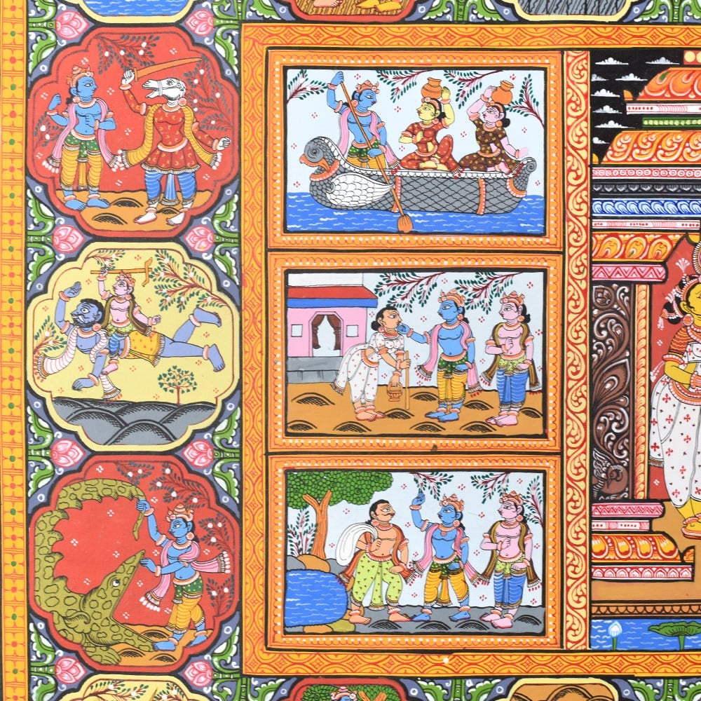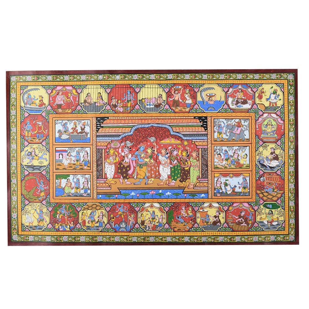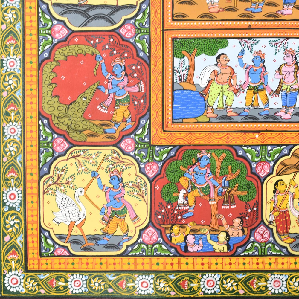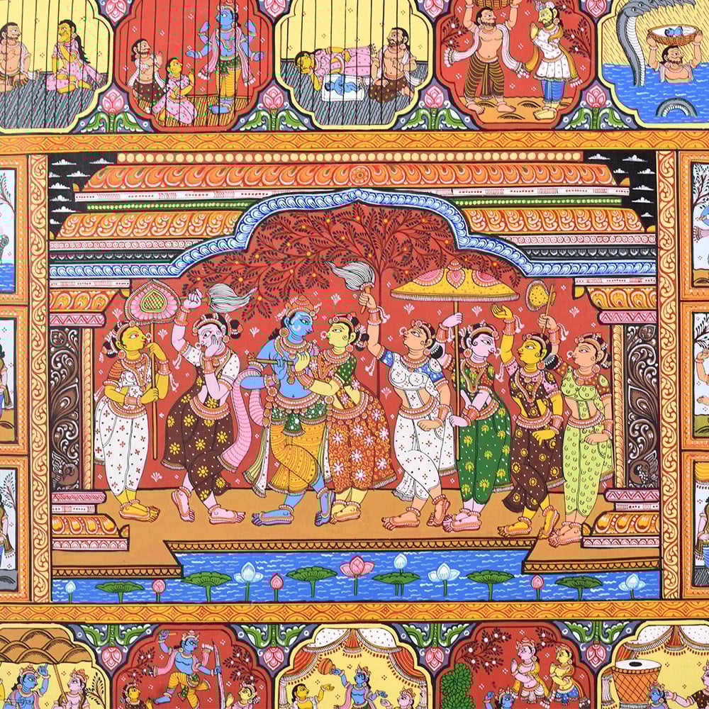 A beautiful Pattachitra painting that vividly illustrates the divine life and leelas (plays) of Lord Krishna. Pattachitra, an ancient traditional art form from Odisha, is known for its intricate details, vibrant colors, and depictions of mythological and spiritual stories. This painting focuses on various key aspects of Lord Krishna’s life, showcasing his divine interventions, playful childhood, and his spiritual teachings. At the center of the painting, we see a lively depiction of Lord Krishna surrounded by his devotees and companions, highlighting his role as a divine leader and protector. Krishna is often shown in the midst of performing his divine leela, with scenes portraying his childhood mischiefs and miraculous acts. One prominent aspect of Krishna's life that stands out in this painting is his interactions with the Gopis (cowherd girls) and his love for Radha. The scenes surrounding the central image reflect his playful nature and his deep connection with nature and his devotees. The painting also showcases Krishna's divine role in various mythological events. Another panel captures his mesmerizing flute playing, which is a significant symbol of his ability to enchant and captivate the hearts of all who hear it. The borders of the painting are richly adorned with detailed motifs and intricate patterns, typical of Pattachitra art. These include natural elements such as flowers, animals, and celestial symbols, which complement the divine scenes depicted within the artwork. The use of vibrant colors, including reds, yellows, and greens, adds to the overall sense of vibrancy and divine energy, creating an atmosphere of devotion and reverence. Overall, this Pattachitra painting beautifully captures the essence of Lord Krishna’s life and his divine presence. It offers a visual journey through his miracles, teachings, and spiritual significance, making it both a work of art and a medium for spiritual storytelling.