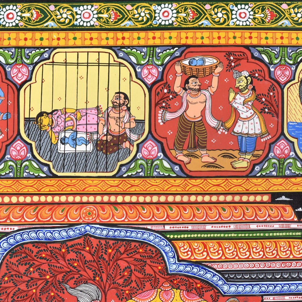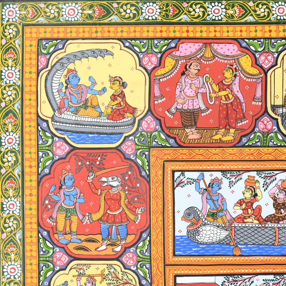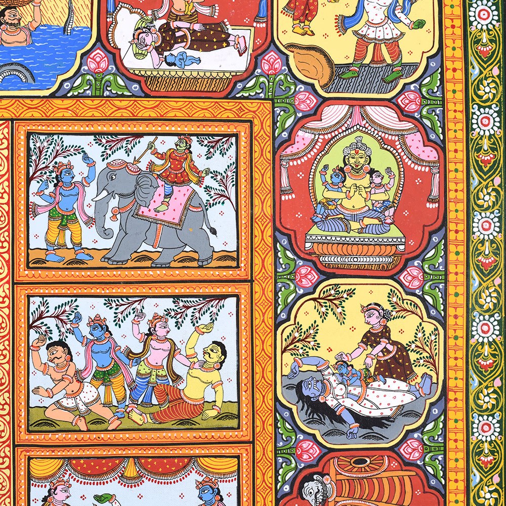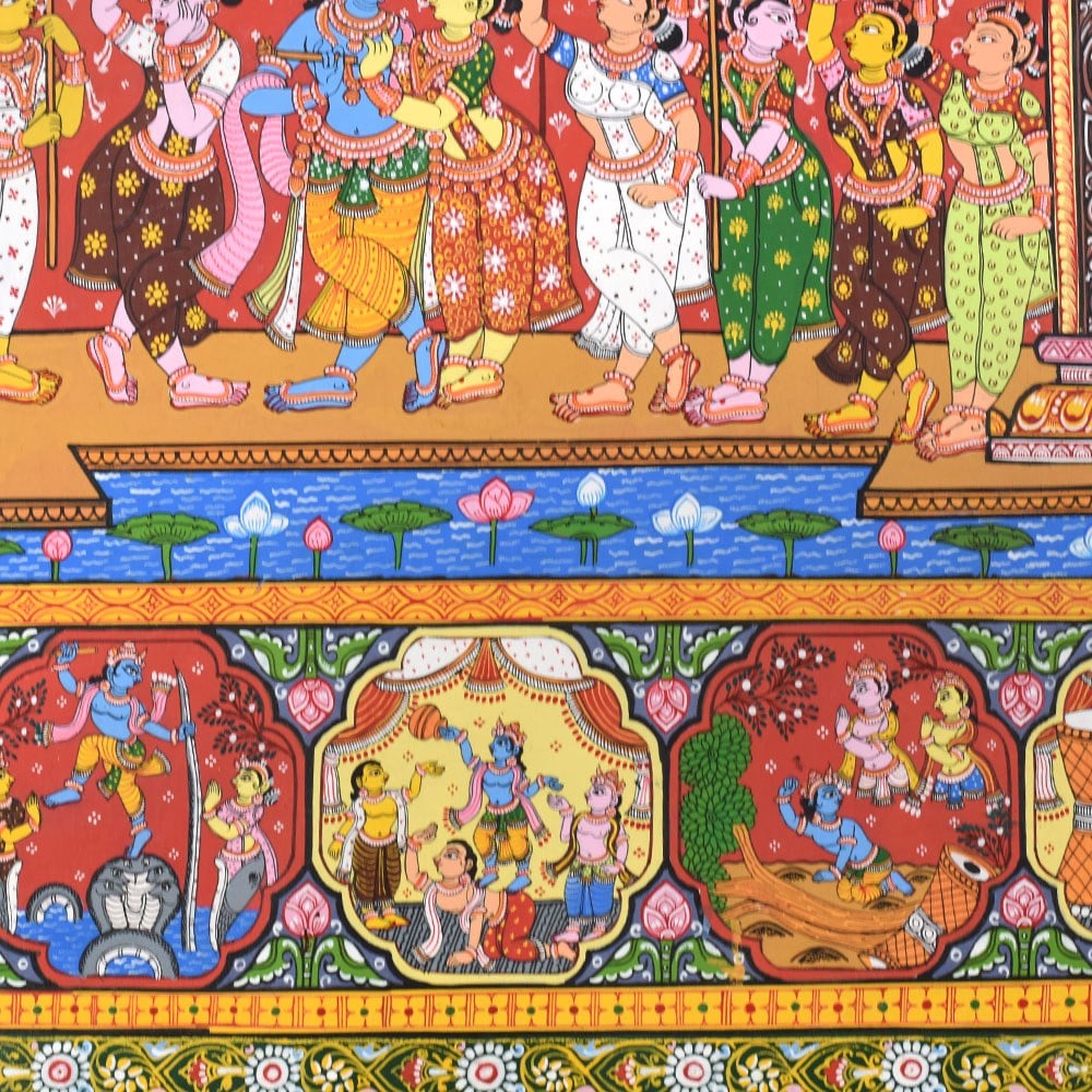 A beautiful Pattachitra painting that vividly illustrates the divine life and leelas (plays) of Lord Krishna. Pattachitra, an ancient traditional art form from Odisha, is known for its intricate details, vibrant colors, and depictions of mythological and spiritual stories. This painting focuses on various key aspects of Lord Krishna’s life, showcasing his divine interventions, playful childhood, and his spiritual teachings. At the center of the painting, we see a lively depiction of Lord Krishna surrounded by his devotees and companions, highlighting his role as a divine leader and protector. Krishna is often shown in the midst of performing his divine leela, with scenes portraying his childhood mischiefs and miraculous acts. One prominent aspect of Krishna's life that stands out in this painting is his interactions with the Gopis (cowherd girls) and his love for Radha. The scenes surrounding the central image reflect his playful nature and his deep connection with nature and his devotees. The painting also showcases Krishna's divine role in various mythological events. Another panel captures his mesmerizing flute playing, which is a significant symbol of his ability to enchant and captivate the hearts of all who hear it. The borders of the painting are richly adorned with detailed motifs and intricate patterns, typical of Pattachitra art. These include natural elements such as flowers, animals, and celestial symbols, which complement the divine scenes depicted within the artwork. The use of vibrant colors, including reds, yellows, and greens, adds to the overall sense of vibrancy and divine energy, creating an atmosphere of devotion and reverence. Overall, this Pattachitra painting beautifully captures the essence of Lord Krishna’s life and his divine presence. It offers a visual journey through his miracles, teachings, and spiritual significance, making it both a work of art and a medium for spiritual storytelling.