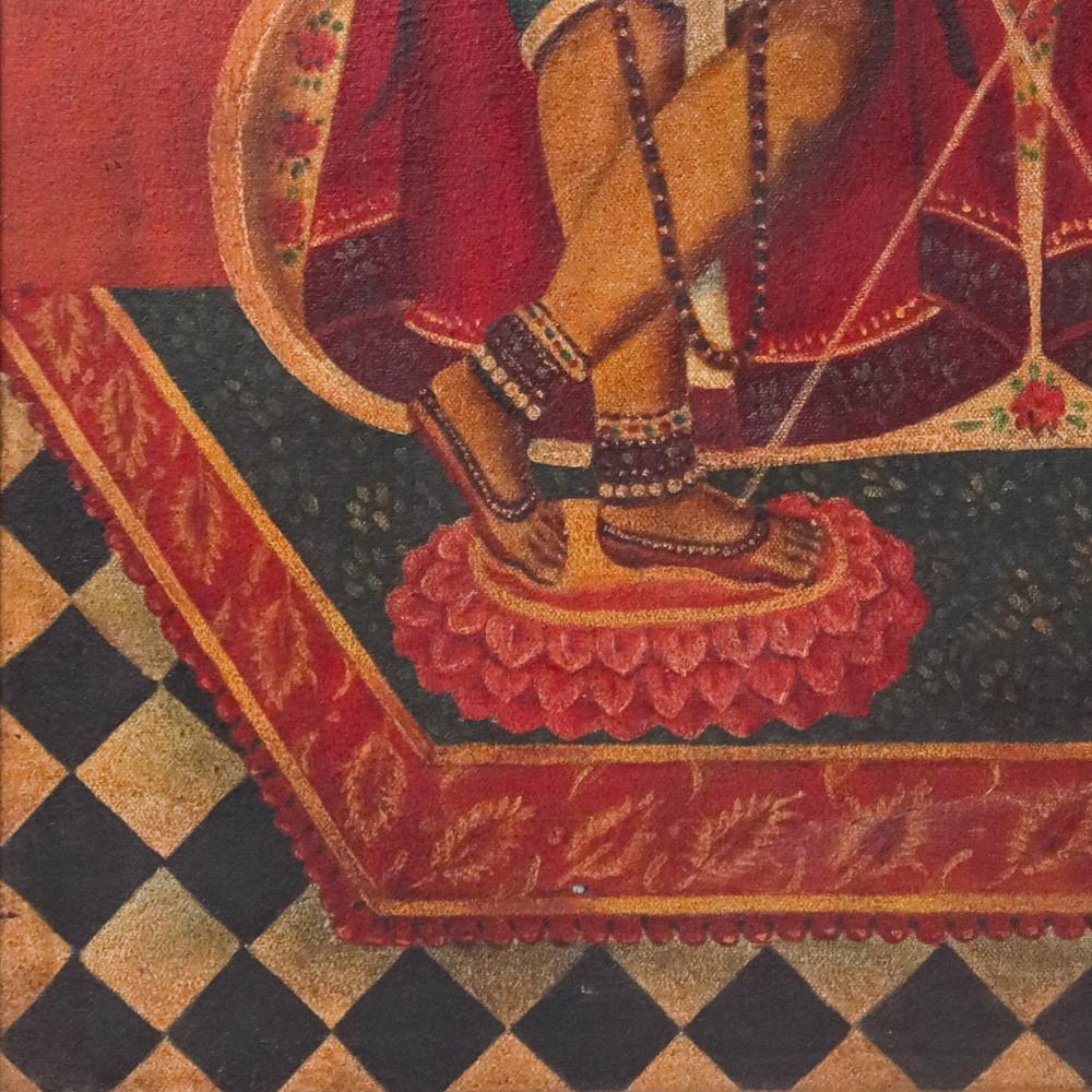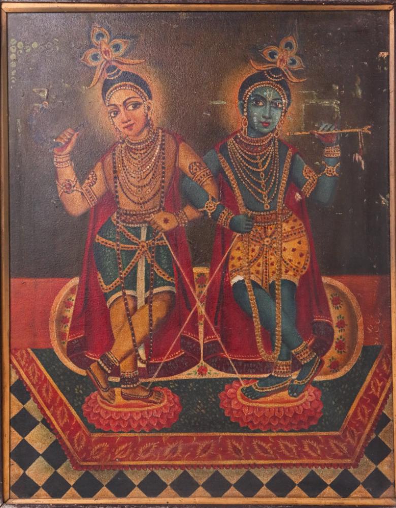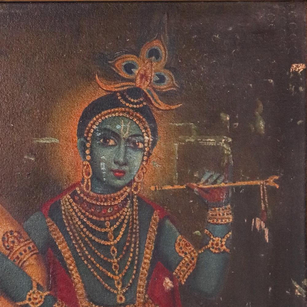 - Oil painting on canvas featuring Lord Krishna and Balram in traditional attire.