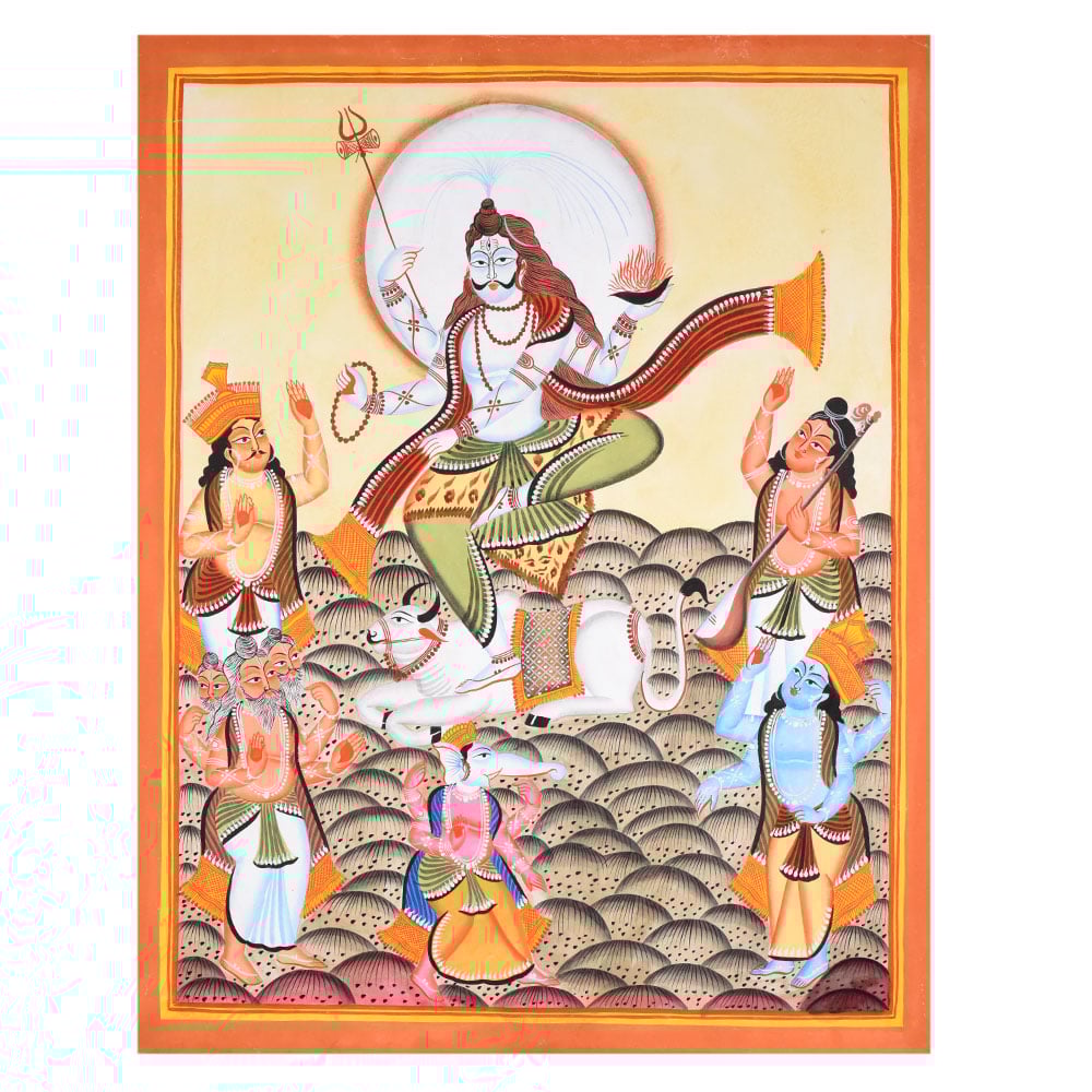 Central depiction of Lord Shiva as Nataraja with trident, flame, and expressive dance posture Presence of Nandi the bull beneath Shiva, richly decorated and symbolically placed Surrounding devotees and attendants shown in rhythmic, reverential poses Bold outlines, flat color planes, and a glowing halo typical of Kalighat painting styleProduct Specification