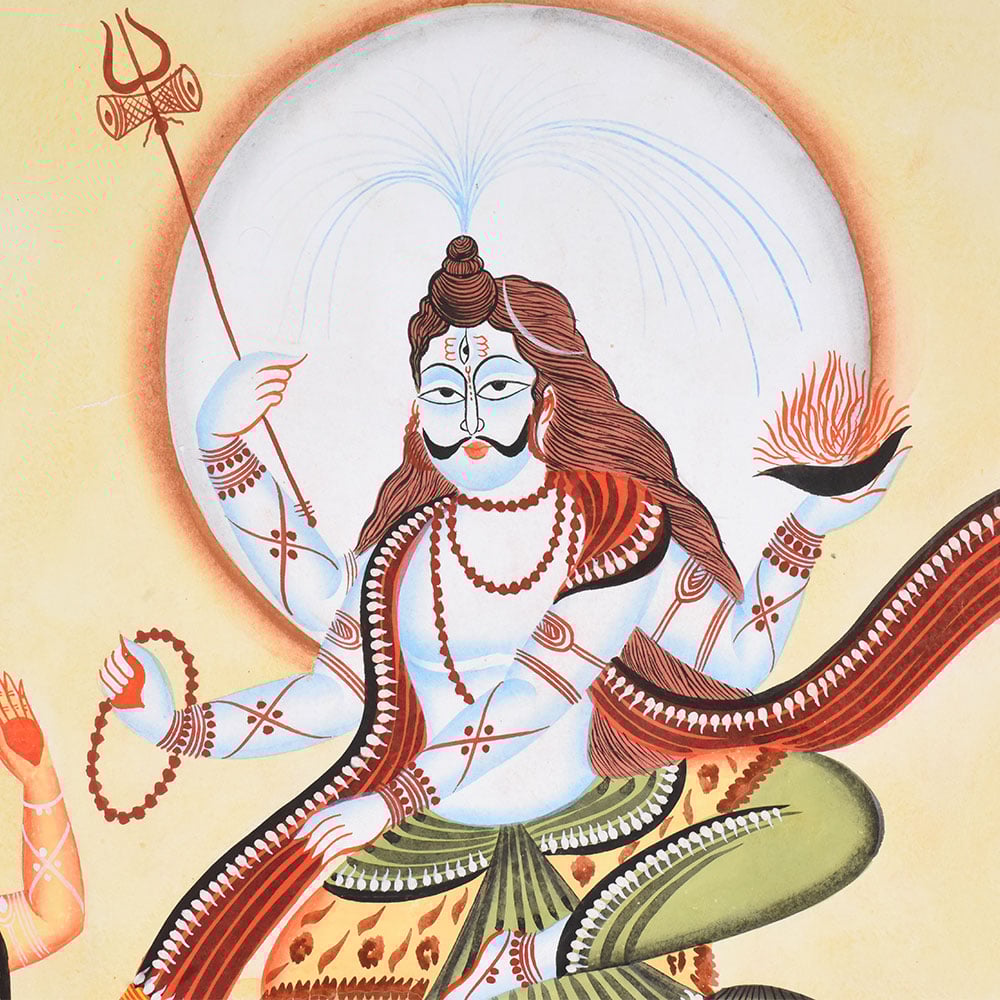 This Kalighat painting on cloth and paper depicts Lord Shiva as Nataraja, the cosmic dancer, presented in a dramatic yet devotional folk idiom characteristic of the Kalighat school. Shiva occupies the central position, suspended in a graceful dance pose above a stylized landscape of rounded, patterned forms that suggest mountains or sacred ground. His ash-blue body is outlined with confident, flowing lines, and a radiant white halo behind his head emphasizes his divine presence. One hand holds a trident, another a flame symbolizing destruction, while the remaining hands form expressive gestures that balance creation and protection. Shiva is shown seated upon or dancing above Nandi, the sacred bull, who is rendered in soft whites and greys with decorative detailing, reinforcing his role as Shivas loyal vehicle. The surrounding figuressaints, devotees, and divine attendantsare arranged symmetrically around the central figure, their raised hands and musical instruments suggesting reverence, movement, and sound. Their faces, with large almond-shaped eyes and simplified expressions, reflect the Kalighat painters focus on emotional immediacy rather than realism. The palette is warm and vibrant, dominated by reds, yellows, whites, and blues, applied in flat washes with minimal shading. Decorative borders frame the composition, while the background remains uncluttered, allowing the figures to command attention. Executed on cloth and paper, the painting combines sacred symbolism with popular visual language, making the divine accessible to everyday viewers. The scene conveys both cosmic energy and devotional intimacy, embodying the spirit of Kalighat art as a bridge between mythology, ritual, and folk expression.