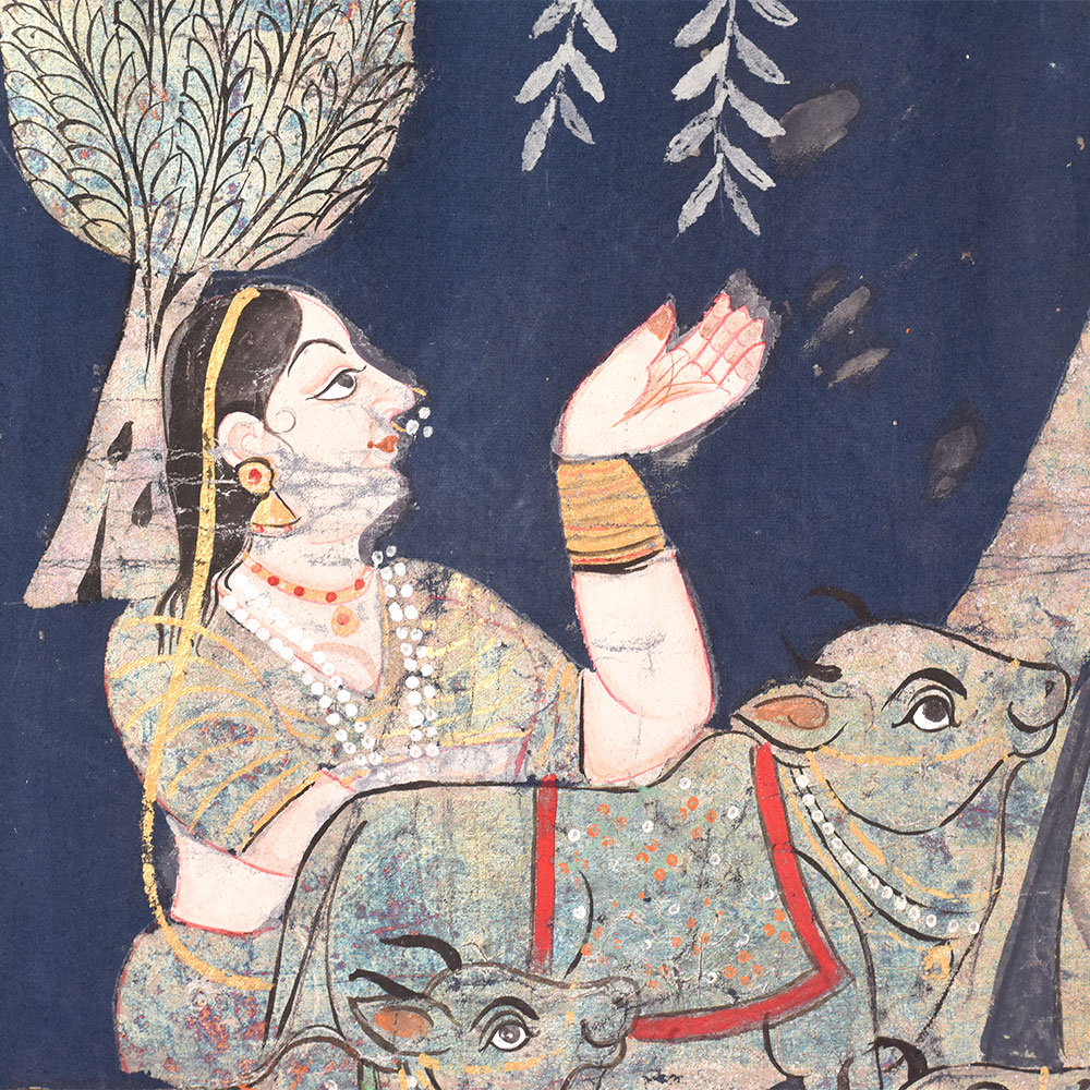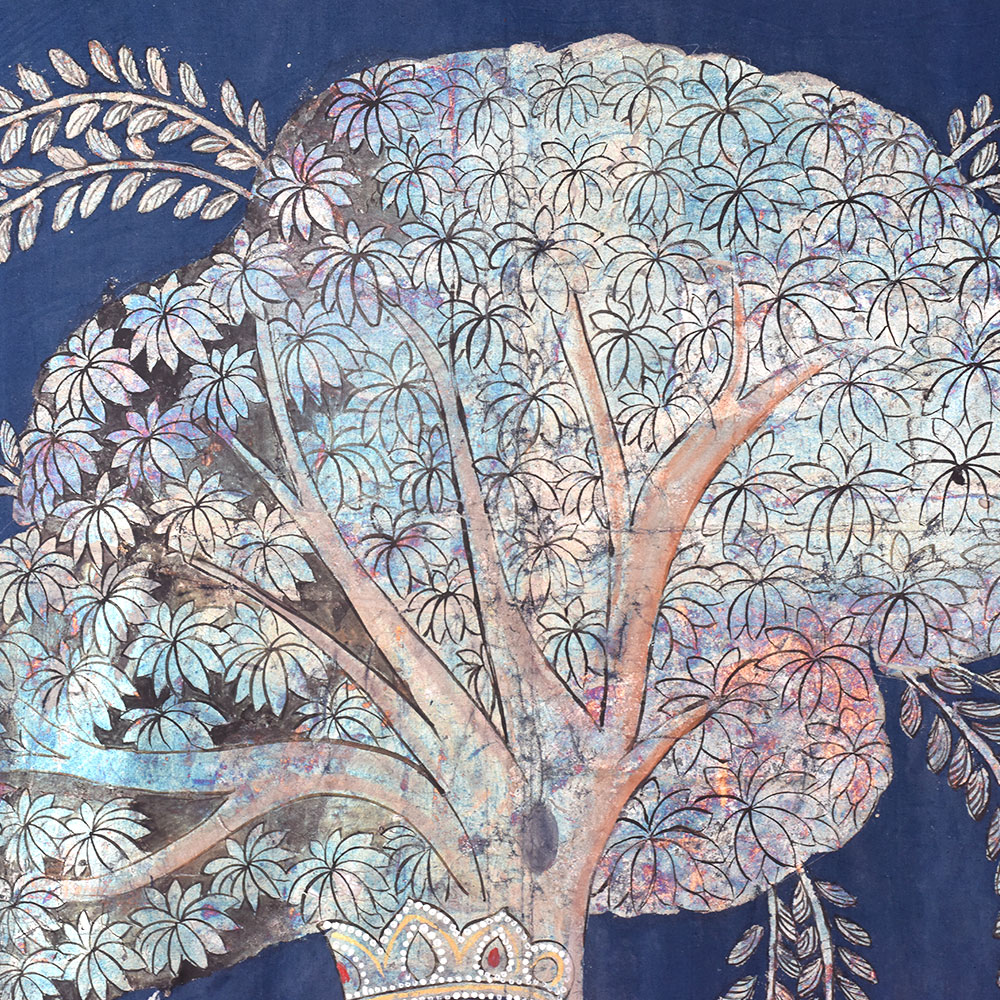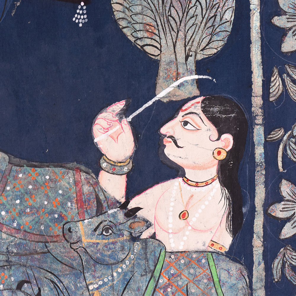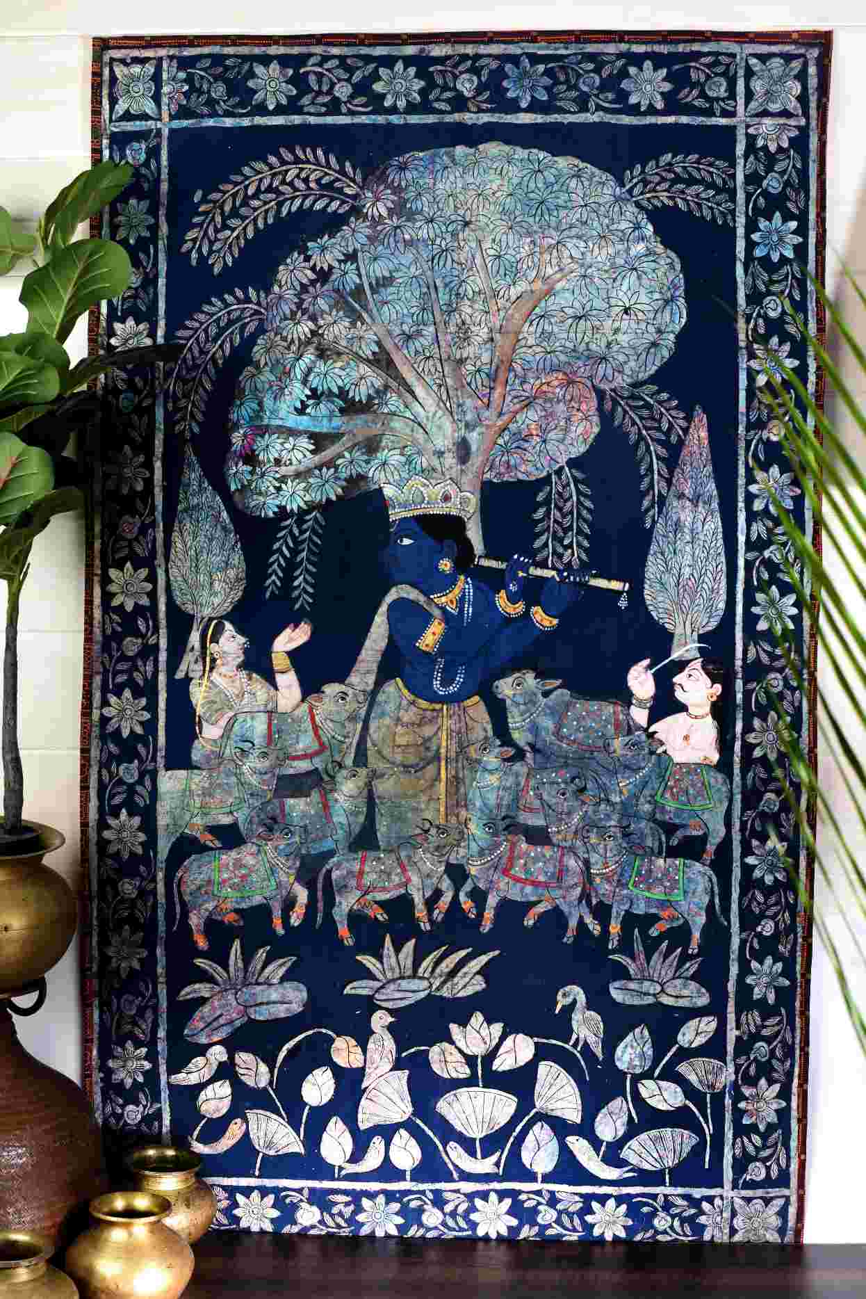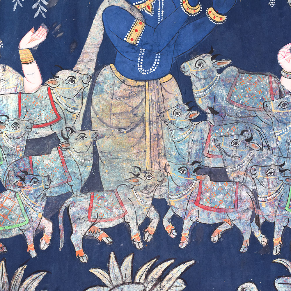 Discover the Celestial Beauty of Lord Krishna in this Exquisite Golconda Art Pichwai Painting Without Frame. Prepare to be captivated by the sheer splendor of this breathtaking Golconda Art Pichwai Painting depicting the divine Lord Krishna. Against a serene backdrop of deep blue, the painting showcases the enchanting Lord playing his flute beneath a majestic tree, surrounded by a herd of adoring cows. This exquisite Golconda Art Pichwai Painting is more than just a work of art - it's a window into the captivating world of Hindu mythology and the divine beauty of Lord Krishna. The painting's intricate silver detailing and the Lord's serene, captivating gaze will transport you to a realm of spiritual wonder and enchantment. Whether you're a collector of fine art, a devotee of Lord Krishna, or simply someone who appreciates the beauty of traditional Indian craftsmanship, this Pichwai painting is a must-have addition to your home or sacred space. Hang it in your living room, meditation area, or puja room, and let the painting's ethereal energy infuse your space with a sense of peace, harmony, and divine connection.