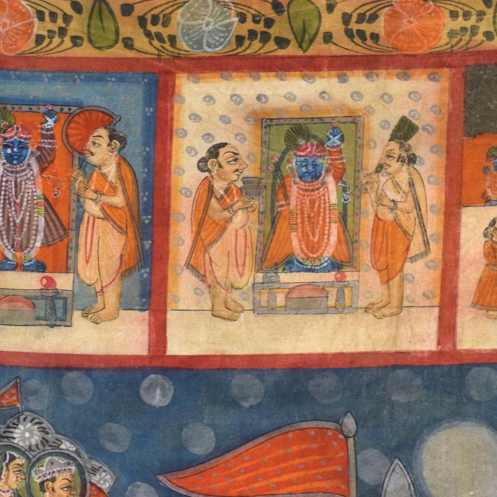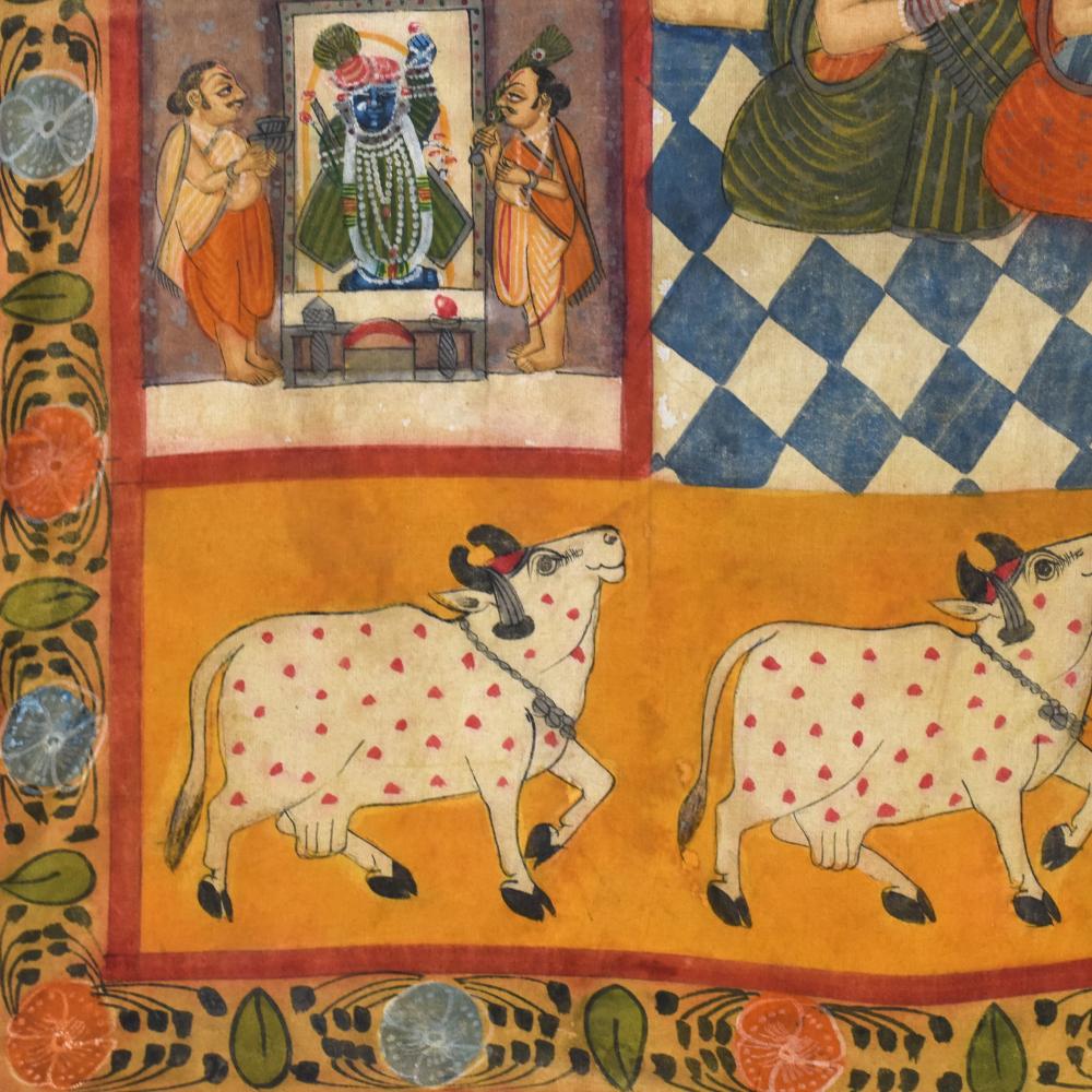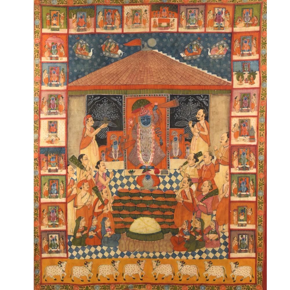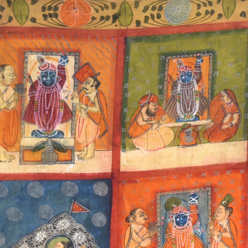 This exquisite Pichwai painting on cloth is a vibrant and intricate representation of devotion to Lord Shrinathji, a revered manifestation of Lord Krishna, worshipped primarily in the Pushtimarg sect of Hinduism. Painted with painstaking detail and vivid natural colors, the artwork captures the divine aura of Shrinathji within the sanctum of his temple, surrounded by devotees and celestial beings. At the center, Shrinathji is depicted in his iconic form—blue-skinned, adorned with jewels and traditional garments, holding his left arm aloft, symbolizing the lifting of Mount Govardhan. He stands beneath a richly decorated temple canopy, with intricately patterned walls and divine motifs surrounding him. The devotees, portrayed with expressive faces and postures, are seen offering prayers, playing musical instruments, and fanning the deity, expressing reverence and bhakti (devotion). The border of the painting is framed with miniature scenes of other divine forms and episodes from Lord Krishna’s life, contributing to the narrative depth and symbolic richness of the artwork. The lower border features sacred cows—symbols of prosperity and veneration in Hindu tradition—further emphasizing the pastoral and divine connection of Krishna as a cowherd boy. Each section of the Pichwai is meticulously painted, reflecting the traditional artistic heritage of Nathdwara in Rajasthan, where Pichwai art has flourished for centuries. This painting not only serves as a devotional object but also as a cultural artifact that encapsulates the aesthetics, beliefs, and rituals of a rich spiritual tradition.