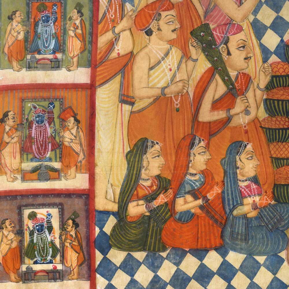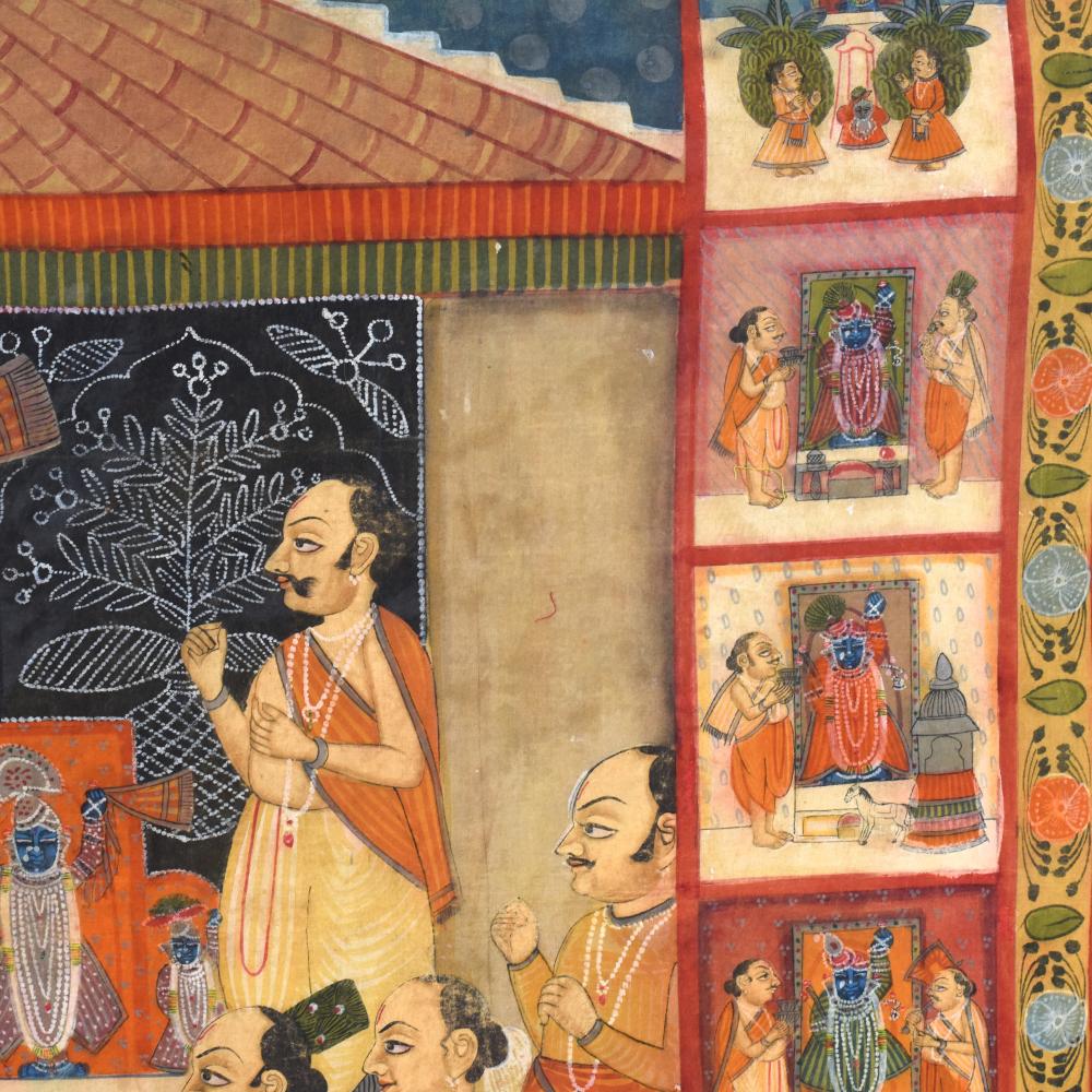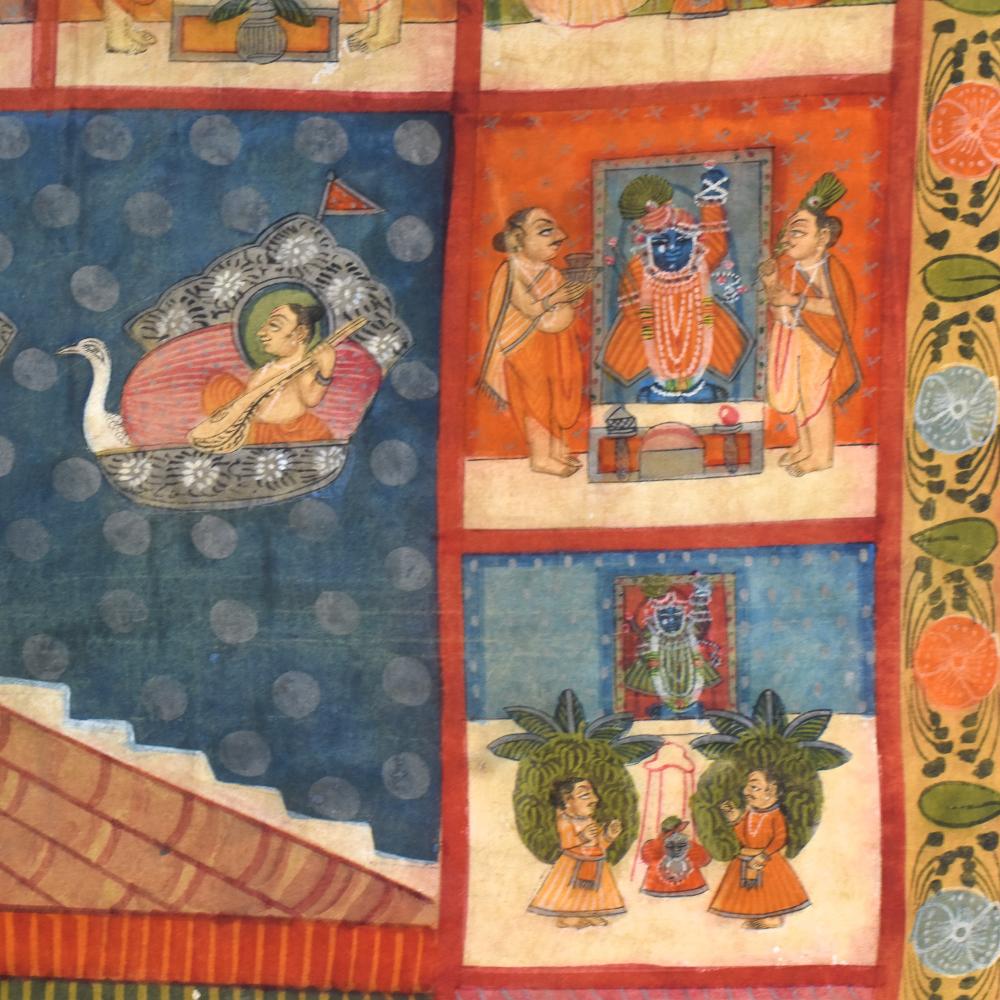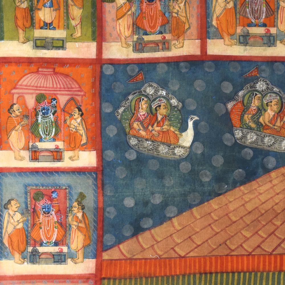This exquisite Pichwai painting on cloth is a vibrant and intricate representation of devotion to Lord Shrinathji, a revered manifestation of Lord Krishna, worshipped primarily in the Pushtimarg sect of Hinduism. Painted with painstaking detail and vivid natural colors, the artwork captures the divine aura of Shrinathji within the sanctum of his temple, surrounded by devotees and celestial beings. At the center, Shrinathji is depicted in his iconic form—blue-skinned, adorned with jewels and traditional garments, holding his left arm aloft, symbolizing the lifting of Mount Govardhan. He stands beneath a richly decorated temple canopy, with intricately patterned walls and divine motifs surrounding him. The devotees, portrayed with expressive faces and postures, are seen offering prayers, playing musical instruments, and fanning the deity, expressing reverence and bhakti (devotion). The border of the painting is framed with miniature scenes of other divine forms and episodes from Lord Krishna’s life, contributing to the narrative depth and symbolic richness of the artwork. The lower border features sacred cows—symbols of prosperity and veneration in Hindu tradition—further emphasizing the pastoral and divine connection of Krishna as a cowherd boy. Each section of the Pichwai is meticulously painted, reflecting the traditional artistic heritage of Nathdwara in Rajasthan, where Pichwai art has flourished for centuries. This painting not only serves as a devotional object but also as a cultural artifact that encapsulates the aesthetics, beliefs, and rituals of a rich spiritual tradition.