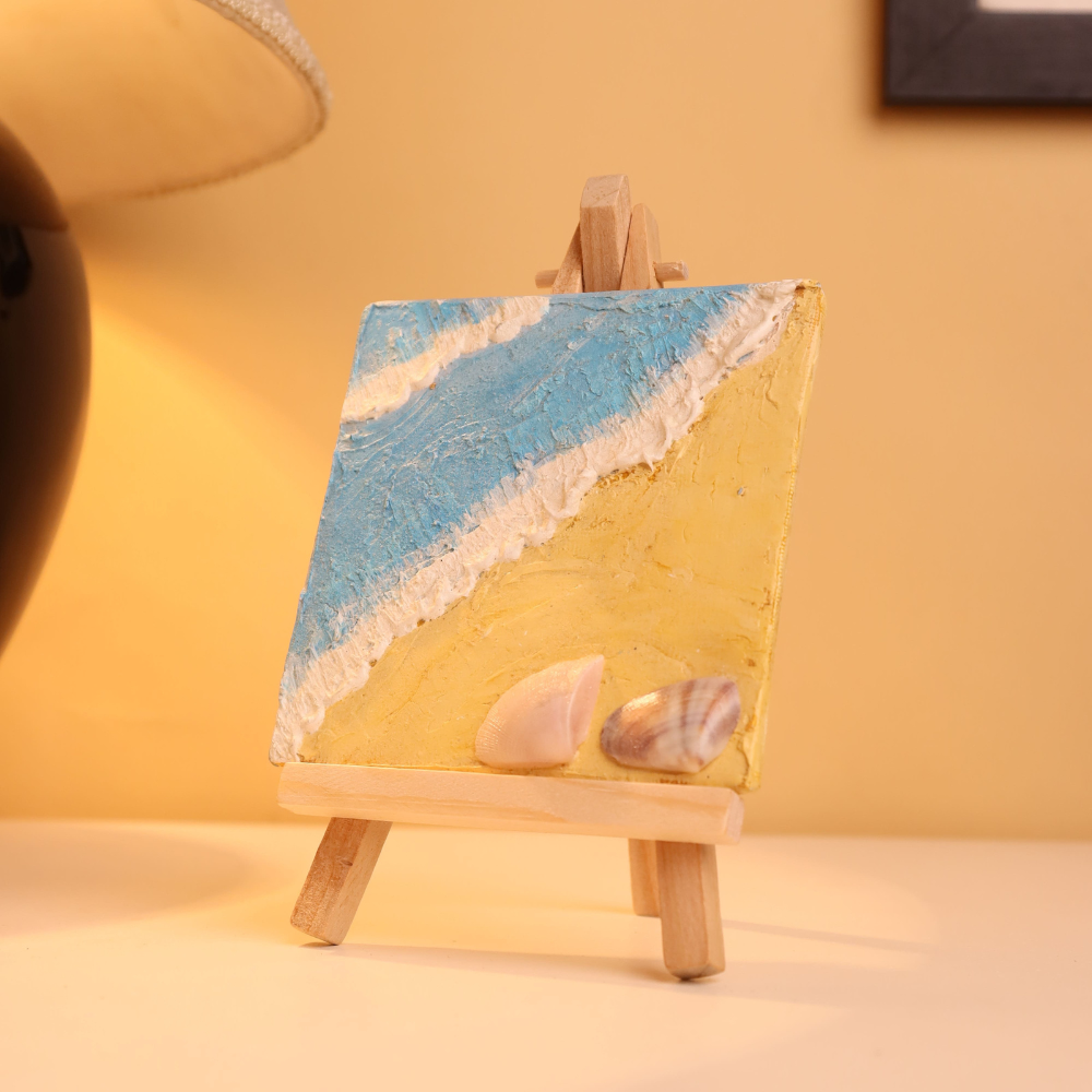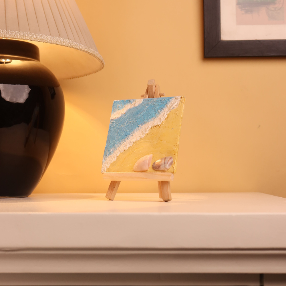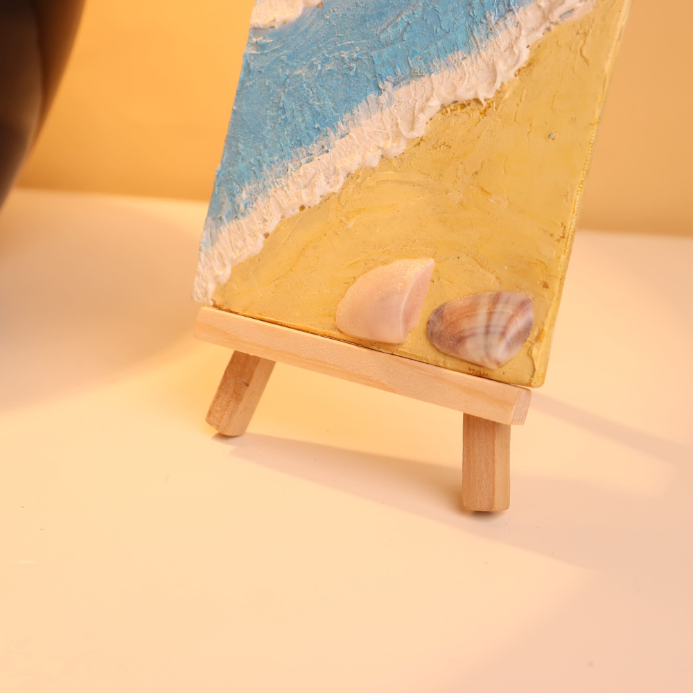 Bring home the serenity of the seaside with this beautiful handcrafted 4x4 inch canvas painting, designed to capture the essence of a tranquil beach moment. Made with real sand, original sea shells, and premium textured paint, this mini masterpiece is perfect for anyone who loves the ocean. The carefully layered textures recreate the soothing waves, golden shoreline, and foamy surf, giving the painting a three-dimensional feel. Accented with natural seashells for an authentic touch, this artwork is mounted on a miniature wooden easel, making it an ideal tabletop decor piece for desks, shelves, or gifting. Each piece is handmade with love, ensuring every wave, shell, and grain of sand is unique. Whether you’re a coastal soul or just want a bit of beachy calm in your space, this compact canvas brings a splash of nature-inspired charm wherever it’s placed.