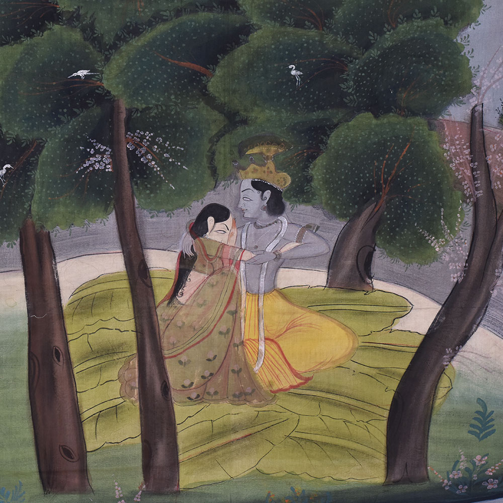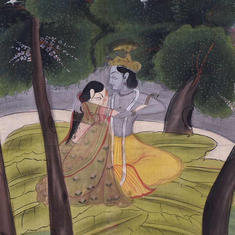 A breath-taking Pichwai painting which is painted by highly skilled Indian artisans that will transport you into the mystical world of Lord Krishna and Radha. This exquisite artwork portrays the divine couple seated on banana leaves amidst the enchanting ambiance of a forest. Painted on fine cloth, it captures the essence of devotion and love, creating a mesmerizing scene that emanates tranquillity and grace. The painting features a striking black border that enhances its beauty and lends a touch of sophistication. Its vibrant and harmonious colours bring the composition to life, making it a captivating addition to any space. Whether displayed in a home, office, art museum, restaurant, hotel, cafe, or exhibition, this masterpiece is guaranteed to mesmerize your guests and become the centerpiece of admiration. Furthermore, this Pichwai painting is not only a stunning decor piece but also a thoughtful gift for your loved ones on special, festive, or auspicious occasions.