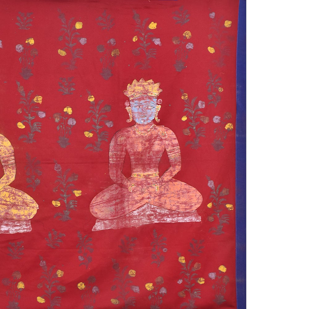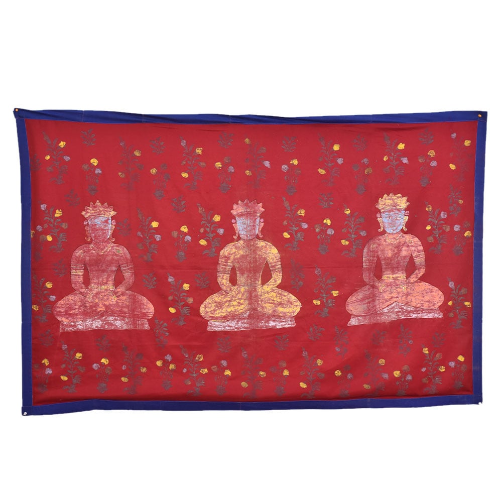 An exquisite pichwai painting on fabric cloth that depicts three Jain gurus in a state of deep meditation, creating a serene and peaceful atmosphere in any room it is placed. The painting is set against a vibrant red background, representing the energy and vitality of life, while the intricate floral patterns adorning it symbolize the beauty and grace of nature. The painting has a beautiful blue border that adds a touch of elegance to the overall composition. The border features intricate designs and patterns that reflect the talent and skill of the professional Indian artists who created it. The painting is painted in multi-colour, with each shade carefully selected to bring out the beauty of the image. This pichwai painting is an auspicious gift for any family, friend, or relative on special or festive occasions. Its calming presence makes it an excellent addition to any prayer room or temple, allowing one to connect with their spiritual side. The painting is a testament to the rich cultural heritage of India and is sure to be treasured by generations to come.