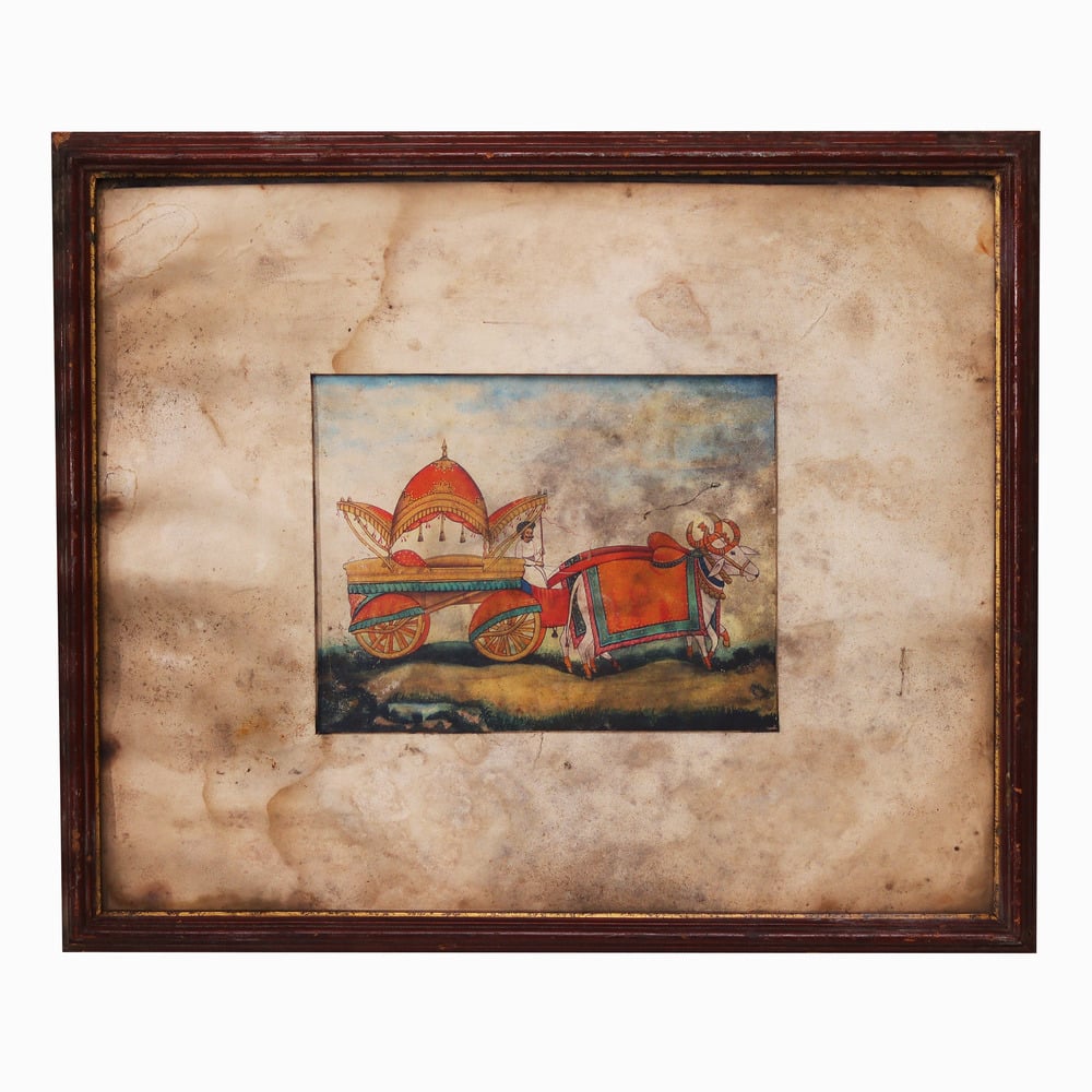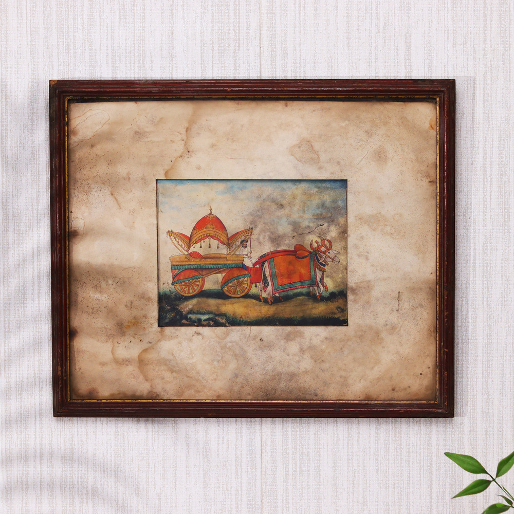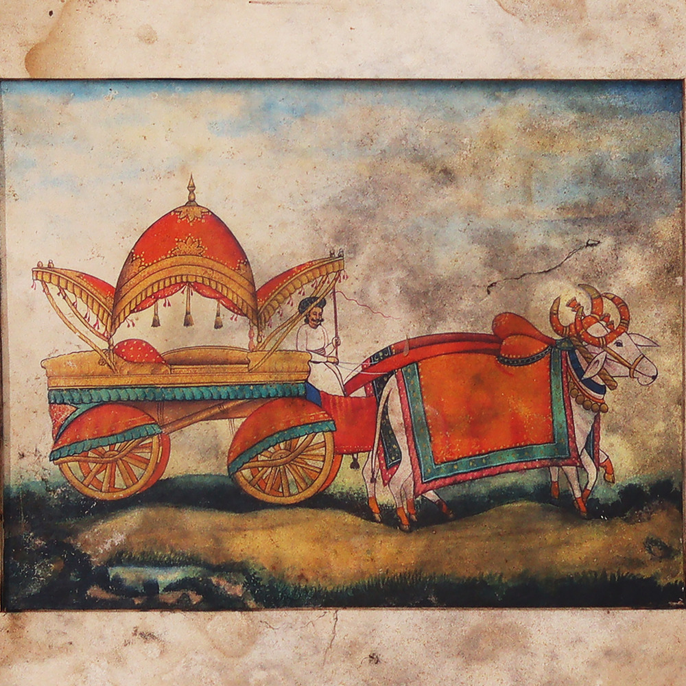 - Meticulously crafted painting of two majestic oxen pulling a traditional Maharaja cart