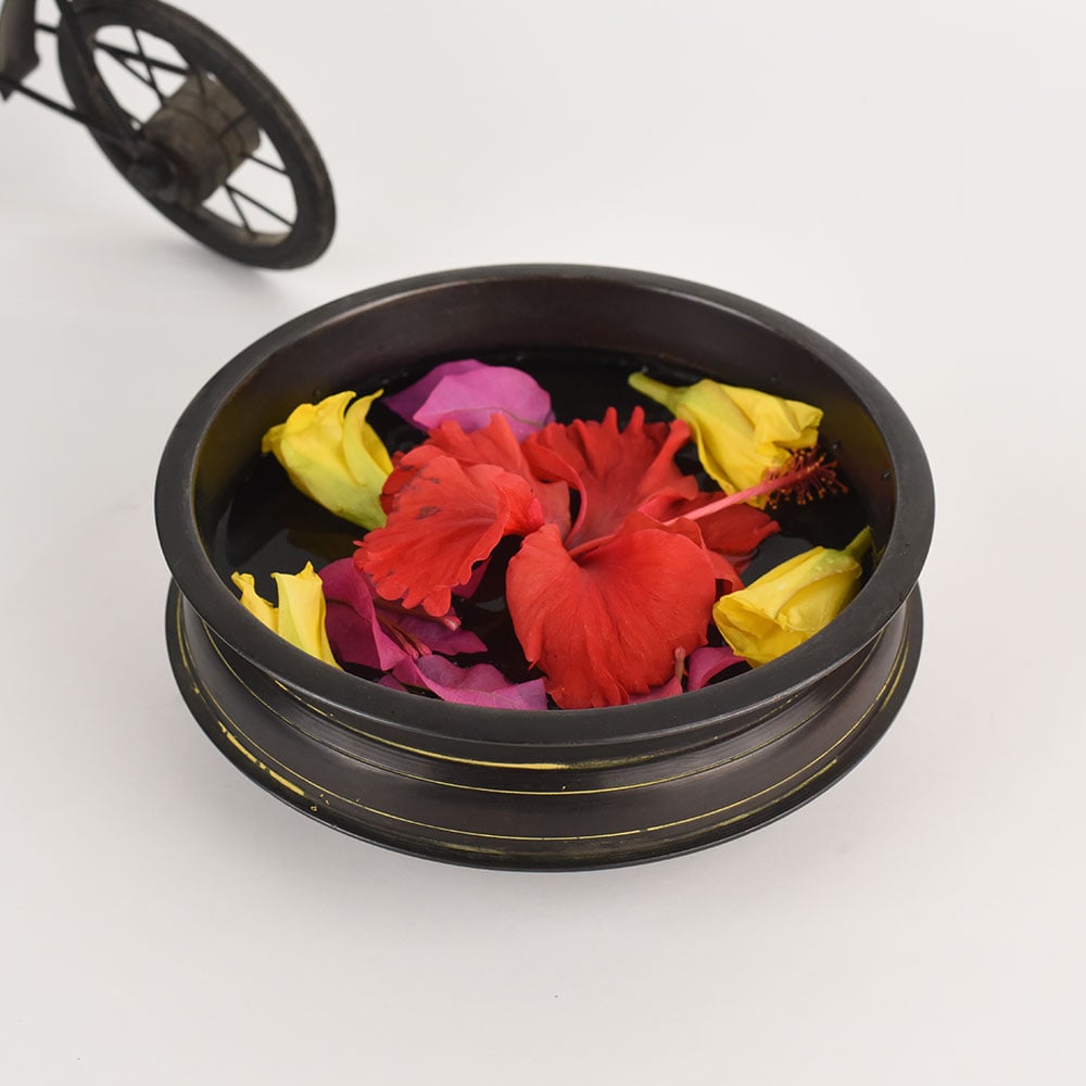 Add rustic elegance to your interior with this round brass urli. Its dark antique finish conveys a sense of history and craftsmanship, while the smooth curved shape invites you to create your own display with water, flowers, or floating candles. Handmade from solid brass, the bowl is both durable and timeless, making it an ideal accent for modern and traditional homes. Use it as a centrepiece for your coffee table, dining table, or entryway console to welcome guests with a serene floral arrangement. The understated design allows it to blend effortlessly with various styles, and its weight lends stability when filled. Each urli may show slight variations in colour and texture, a reminder of the artisanal process behind its creation.