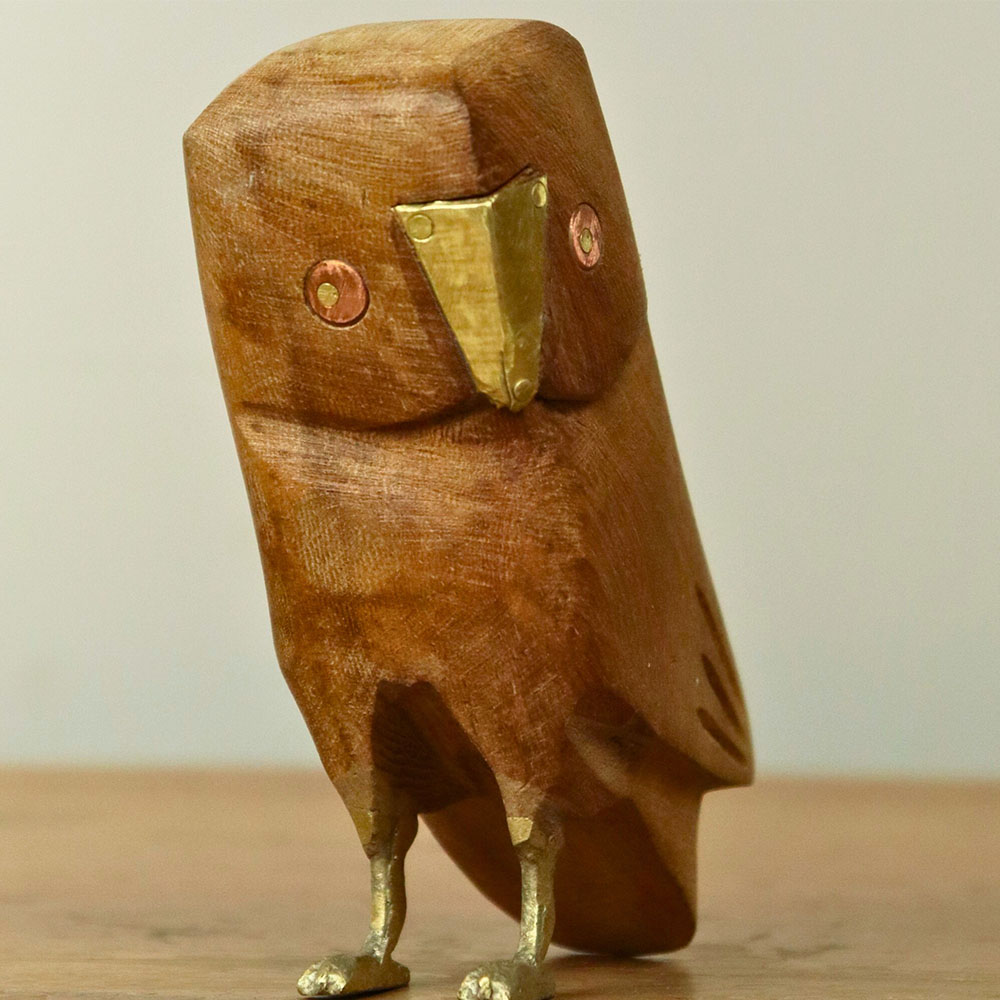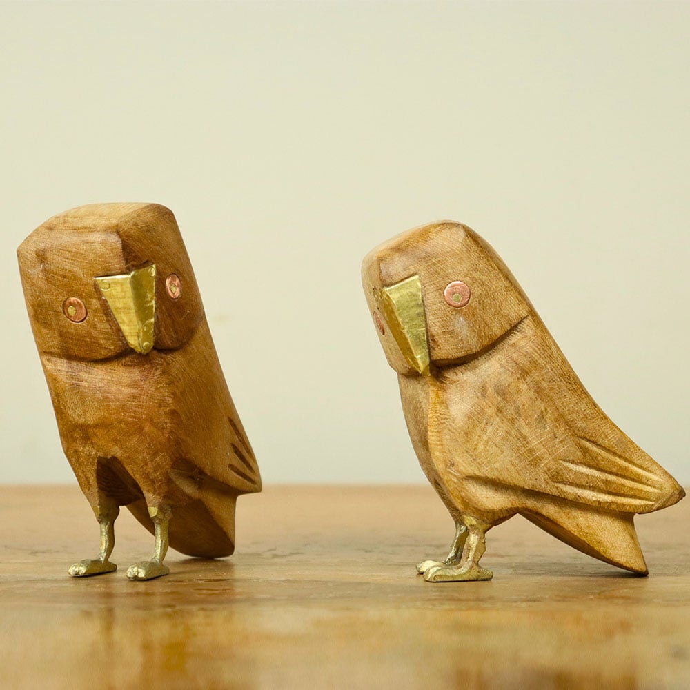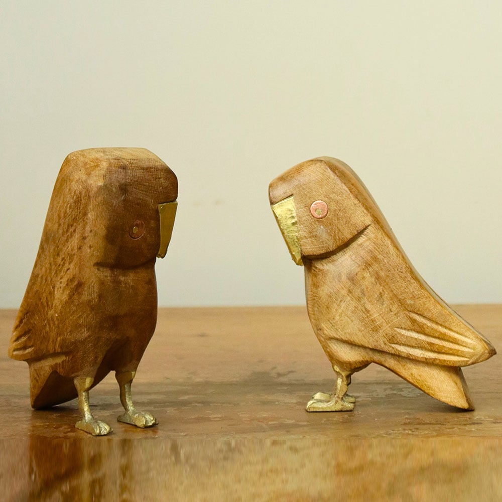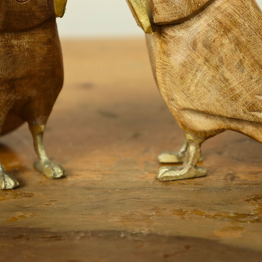 - Natural mango wood with brass beaks, feet, and eye inlays