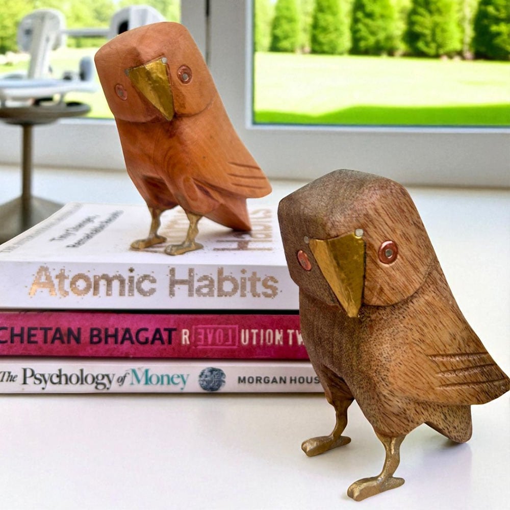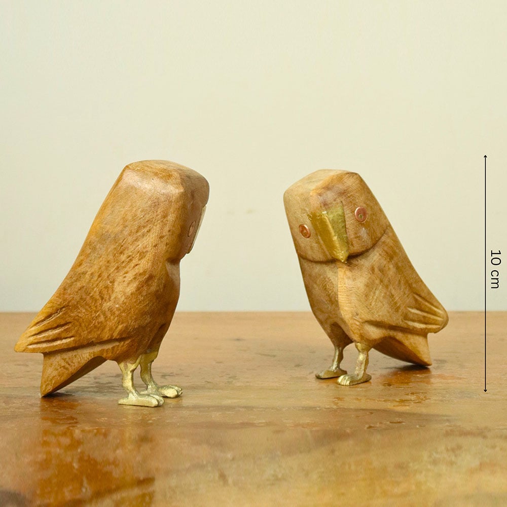 Infuse good luck into your home with these hand-carved wooden owl figurines crafted from natural mango wood and highlighted with brass beaks, feet, and eyes. The pairs simple yet expressive features celebrate Indian folk artistry, resonating with bird lovers, gift buyers, and those who appreciate subtle cultural symbols. Packed & quality-checked by Indianshelf.