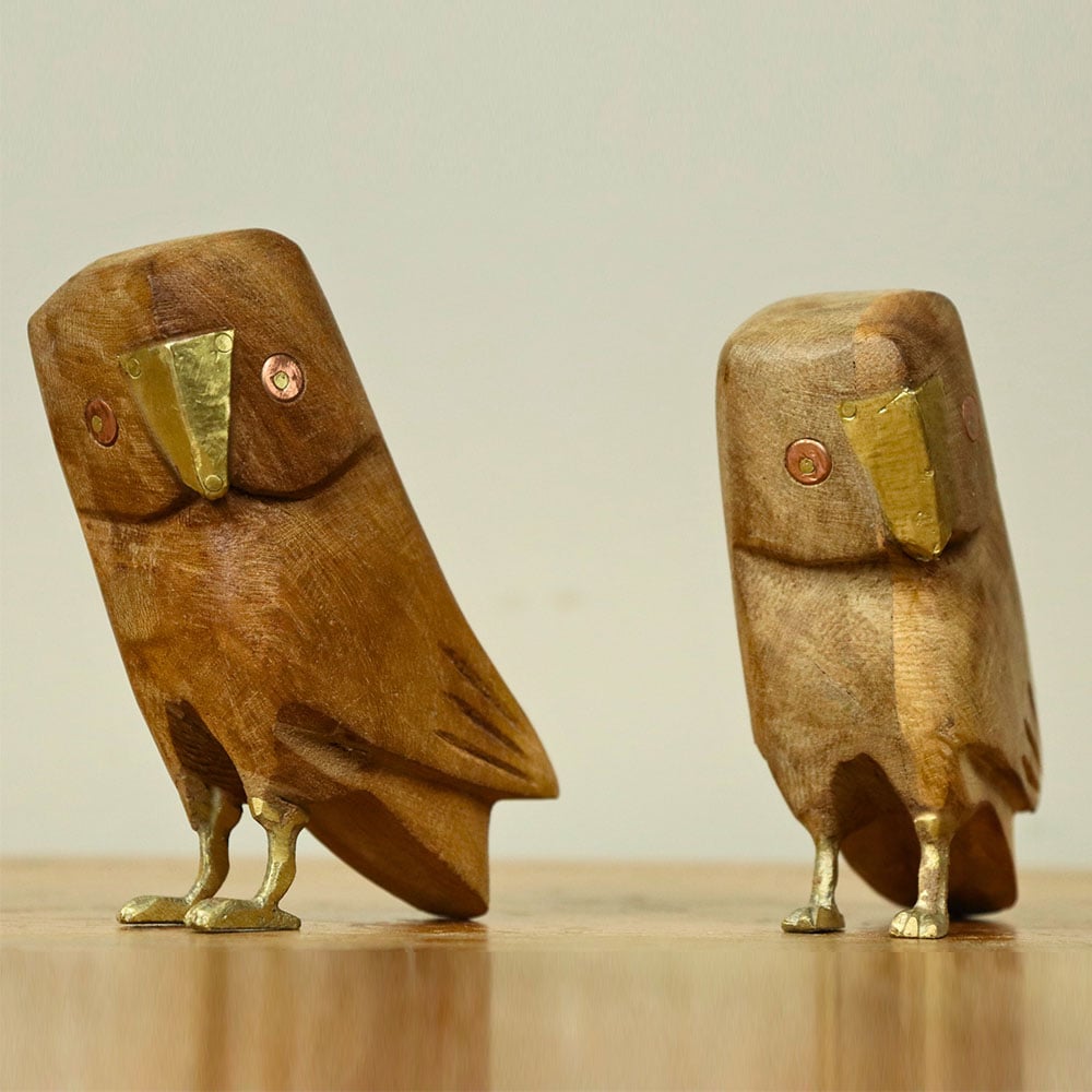 These owl sculptures embody wisdom and serenity. Their warm wooden bodies and gleaming brass eyes exude gentle protection, making them meaningful decor accents and good-luck tokens. They bring storytelling and charm to any space, fostering a connection to artisan tradition.