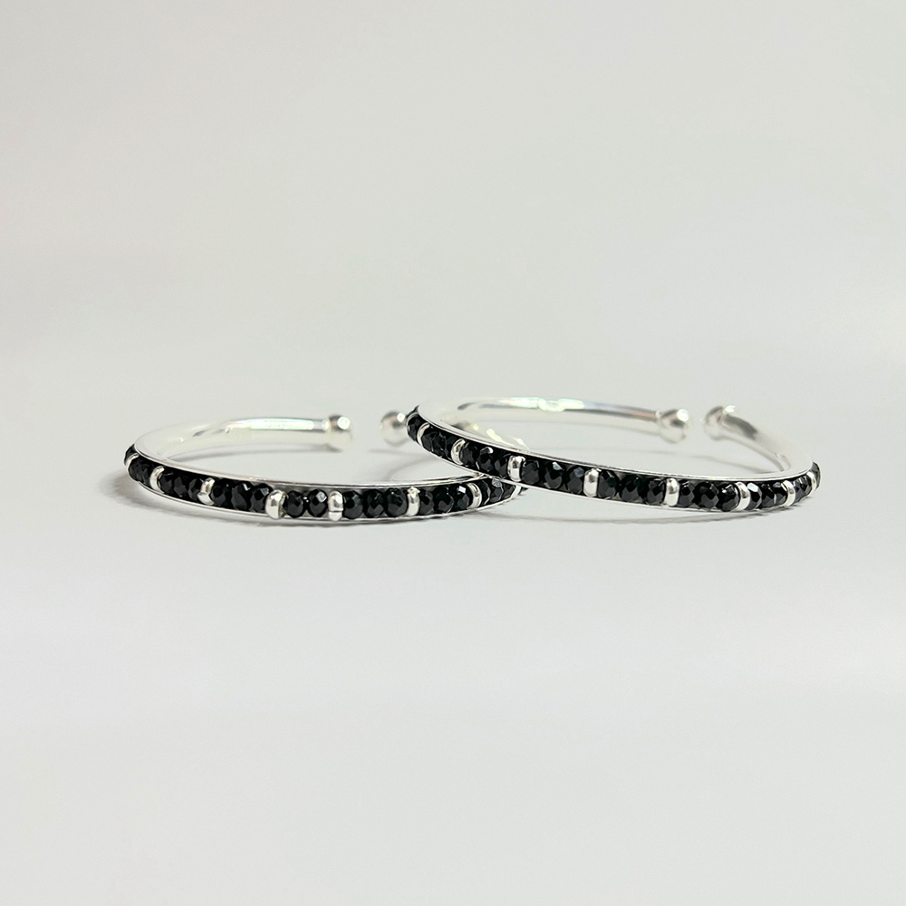 The kada pair features neatly aligned black beads set along a smooth sterling silver curve creating a focused visual rhythm while keeping the form lightweight and wearable.