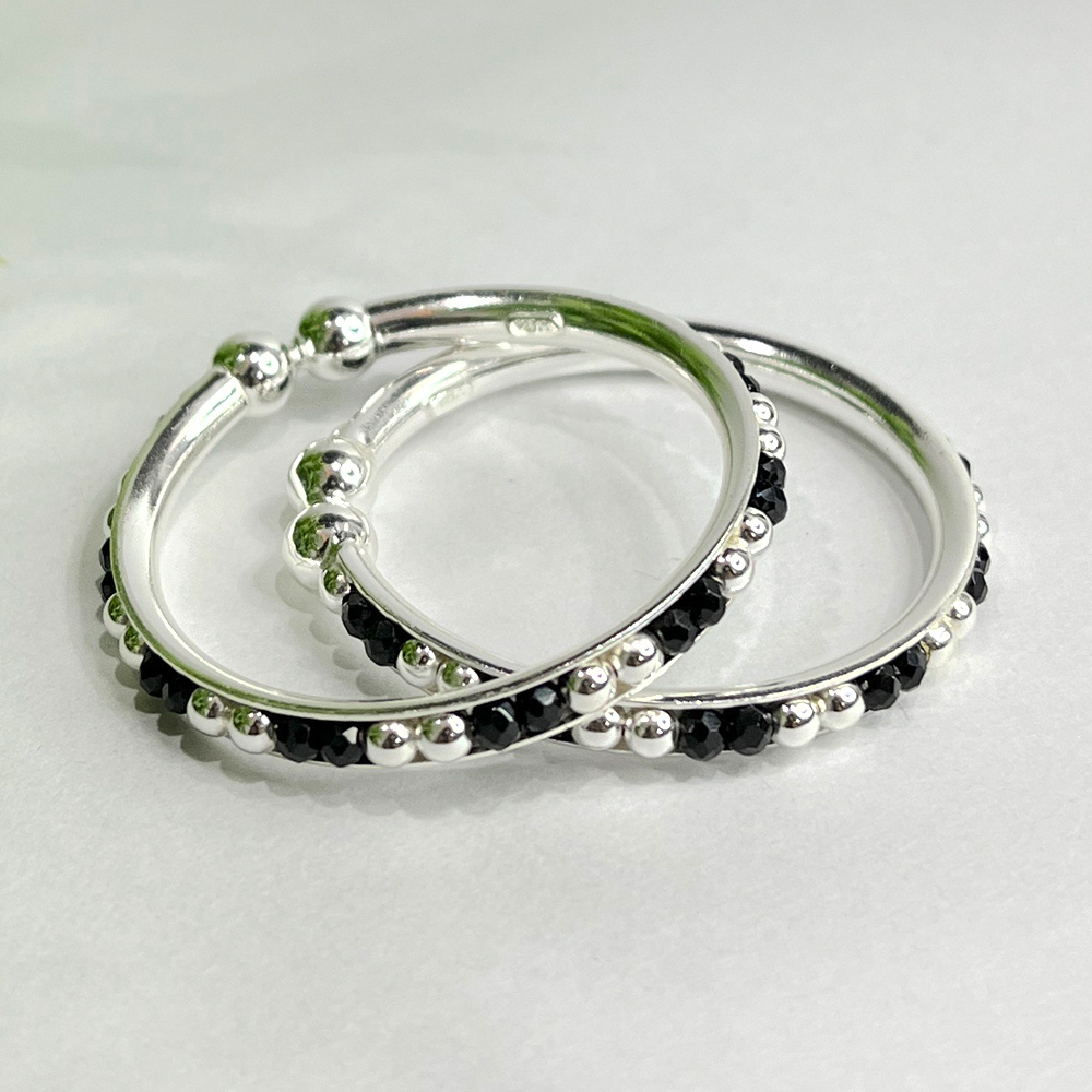 The bracelet pair combines rounded silver edges with evenly arranged bead detailing creating a lightweight form that supports movement and comfort during everyday activities.