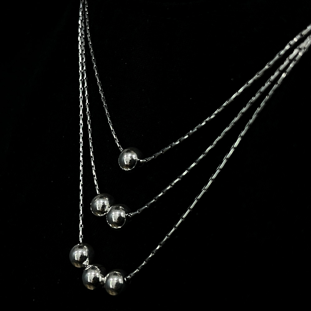 The three layered arrangement with evenly spaced silver balls creates a structured yet fluid form that enhances visual depth without overwhelming the neckline.