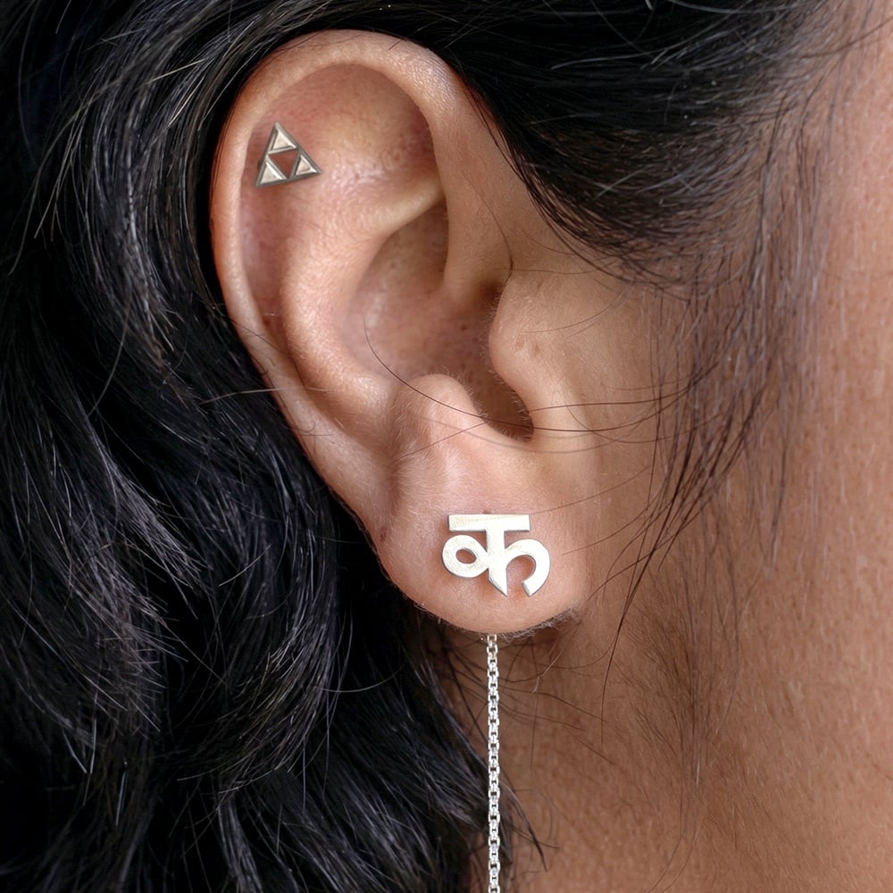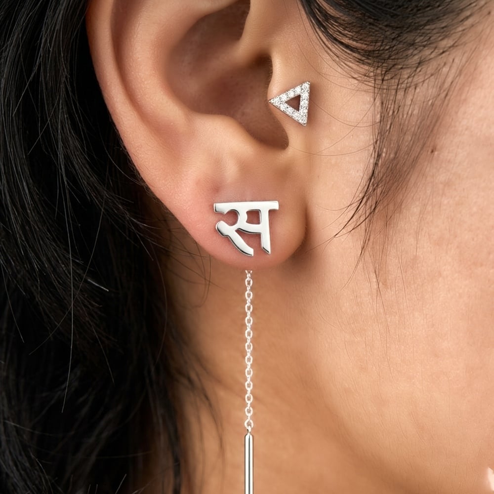 These handcrafted 925 silver personalized Devanagari name dhaga earrings are a unique blend of cultural elegance and modern style. Designed with custom Devanagari lettering, these earrings allow you to wear your name or a meaningful word in a beautifully crafted piece.