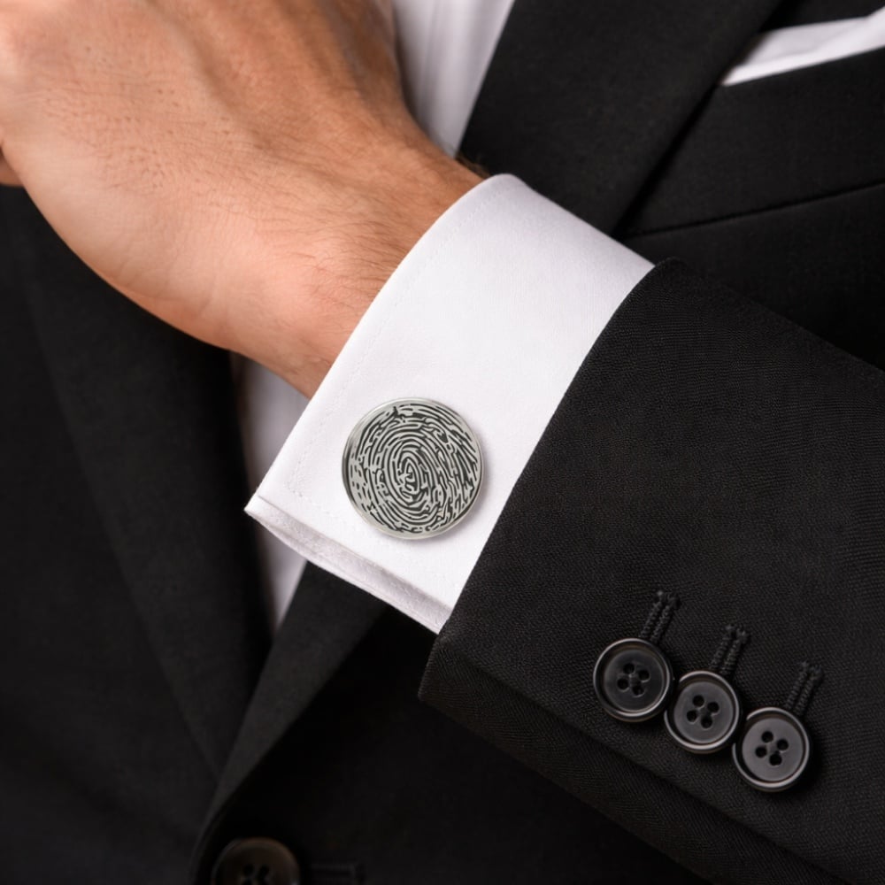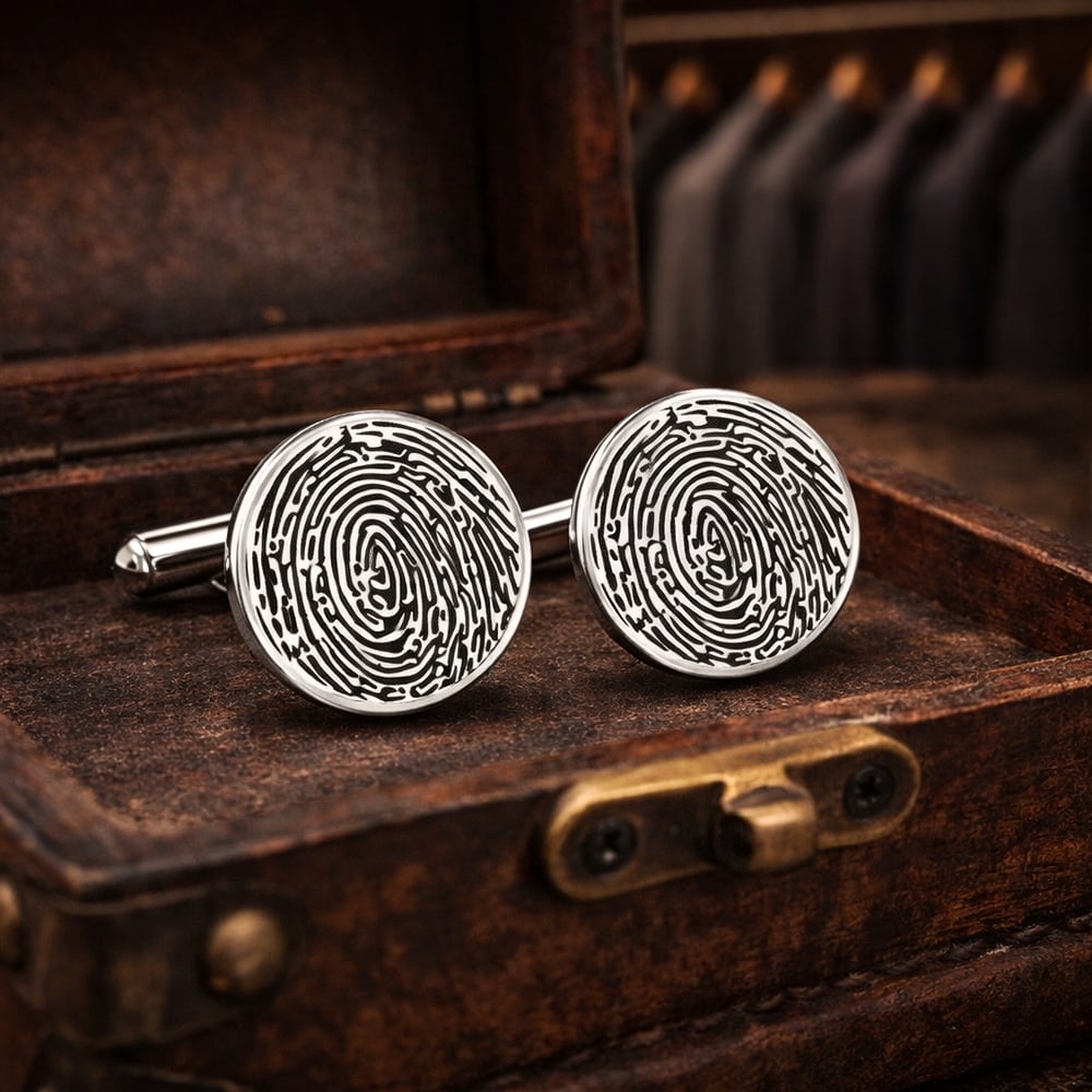 This handcrafted 925 silver personalized fingerprint cufflinks set is designed to transform a classic accessory into a meaningful statement piece. Fully customizable with real fingerprint engraving, these cufflinks capture identity and sentiment while maintaining a refined and polished look.