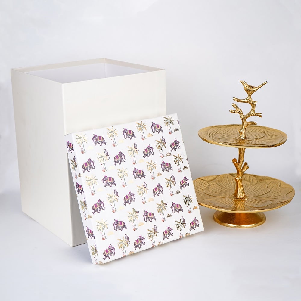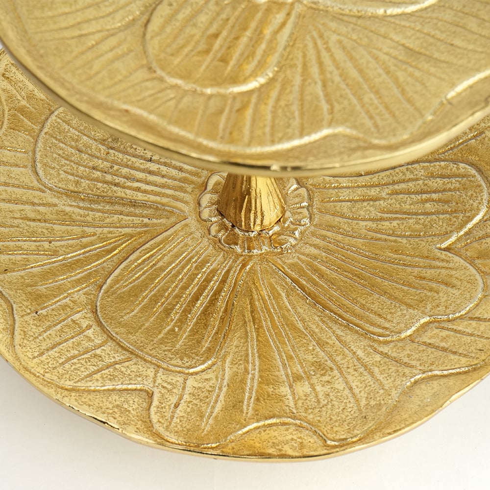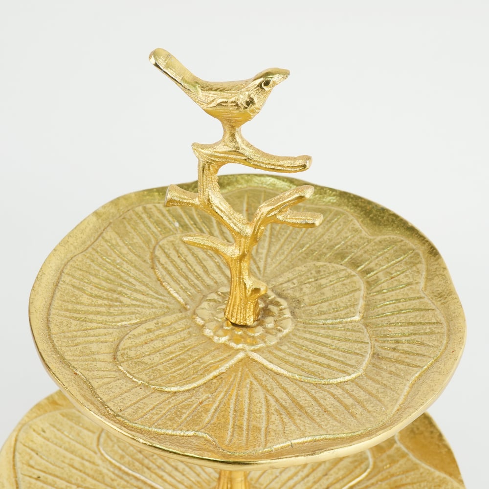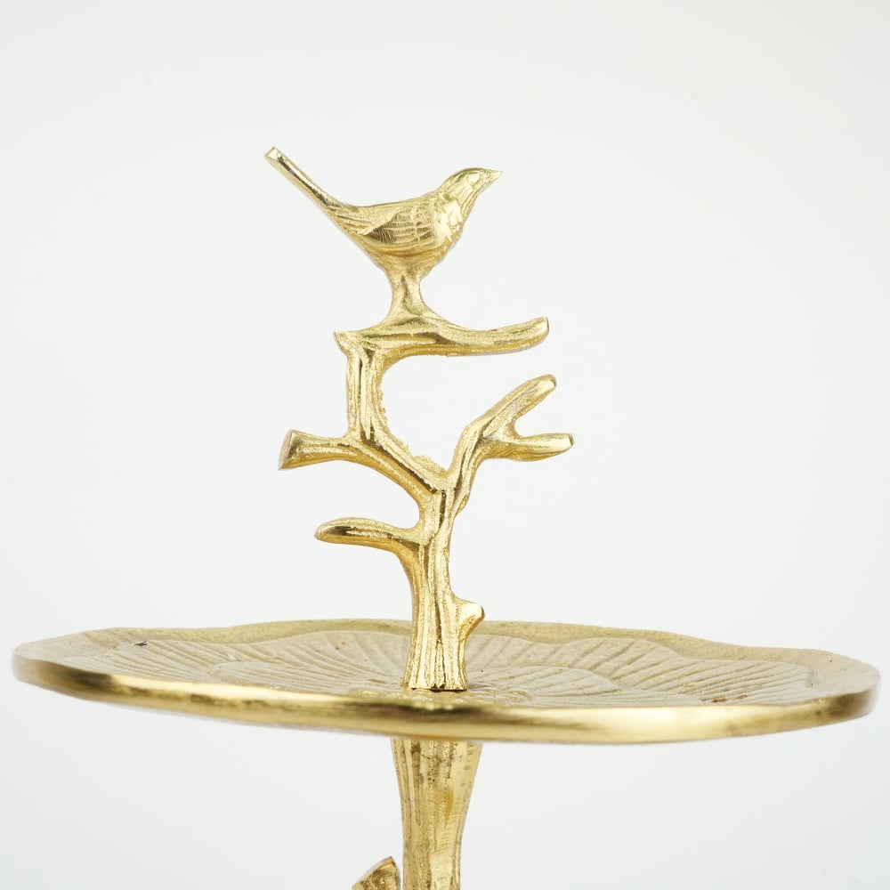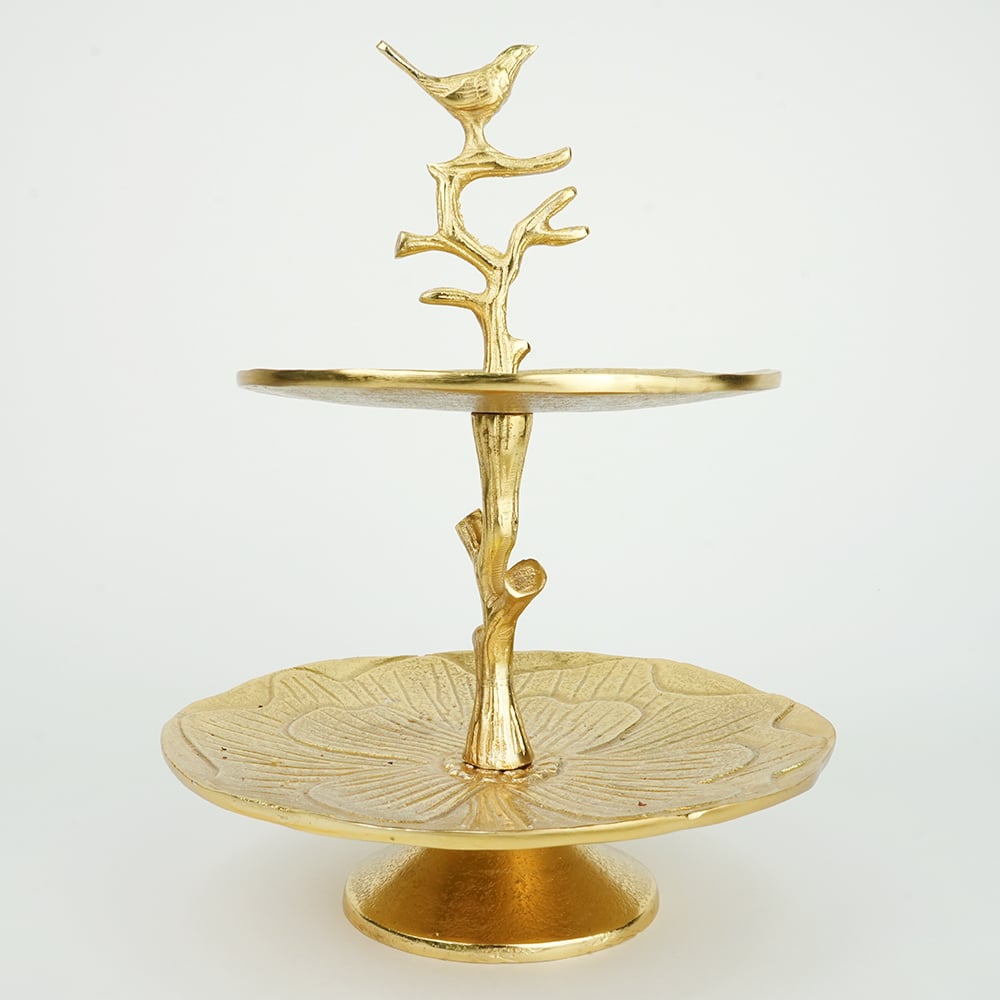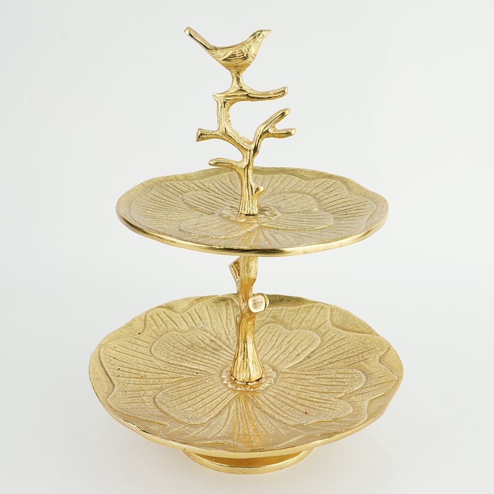 Elevate your dcor with this elegant handcrafted aluminium two-tier tray, crowned with a delicate bird perched on a branch. Featuring beautifully textured plates with a floral-inspired pattern, this piece blends nature-inspired design with timeless craftsmanship. Made from solid brass with a warm golden finish, its perfect for displaying jewelry, sweets, dry fruits, candles, or decorative accents. Ideal for dressing tables, coffee tables, or festive settings, this versatile stand adds charm and sophistication to any space.
