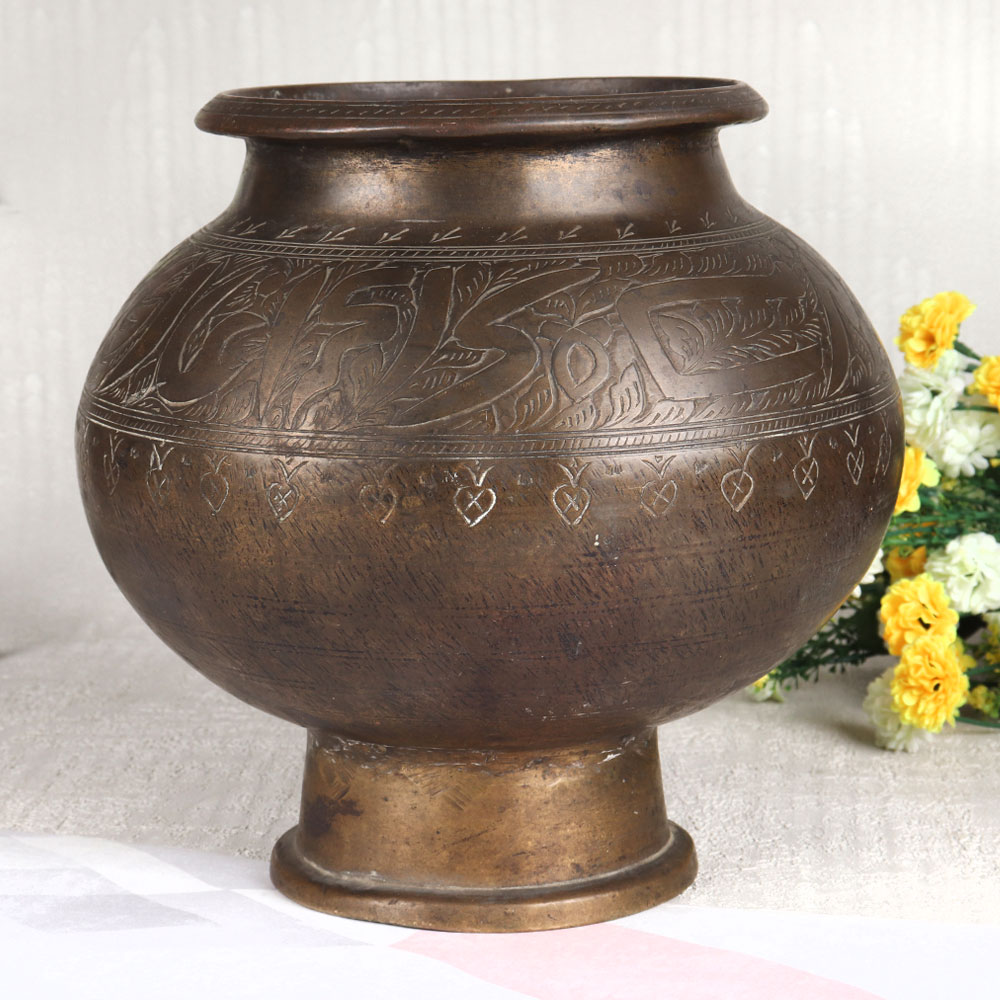 Buy a vintage brass cooking pot online that is a true testament to the craftsmanship of highly talented Indian artisans from Gujarat. Crafted with precision and care, this cooking pot boasts intricate engravings that tell a story of bygone eras, making it a stunning piece of art in antique brown finish. Fashioned from high-quality brass, this pot exhibits remarkable durability and a rich, lustrous sheen that adds an aura of opulence to any setting. While it may have originally been intended for culinary pursuits, we recommend reserving it for decoration purposes only, given its vintage nature. This versatile piece finds its place in a variety of settings, be it at home, office, restaurant, hotel, cafe, or shop. It serves splendidly as a striking flower pot, adding a touch of regal charm to your space. For collectors and enthusiasts, it's an excellent addition to your vintage collection or an enchanting exhibit piece for showcasing your appreciation for history and art. Moreover, this brass pot makes for an exceptional gift, perfect for presenting to loved ones on special, festive, or auspicious occasions.