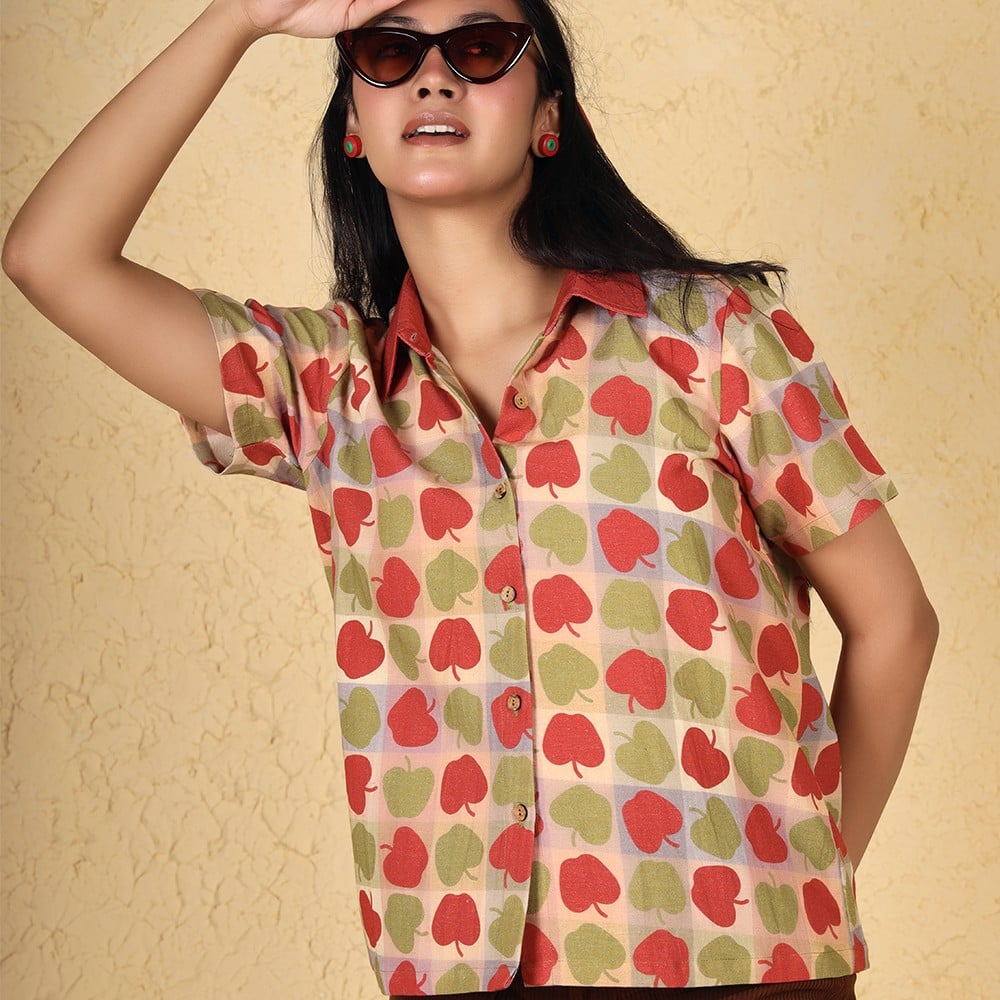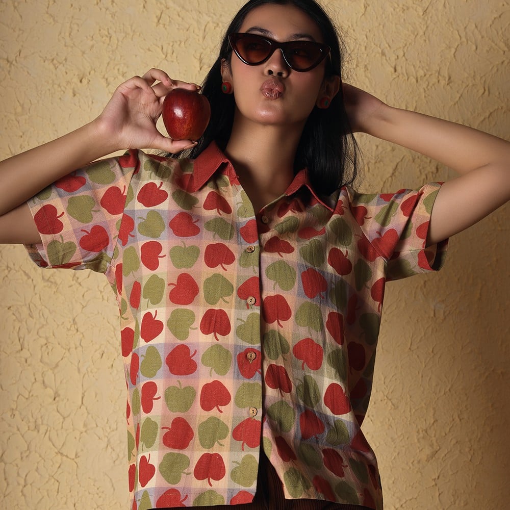 This handcrafted apple print cotton shirt is designed to bring a playful yet effortless charm to everyday styling. Featuring an all-over apple motif in warm red and green tones on a soft checkered base, it offers a fresh and eye-catching look with a touch of vintage appeal.