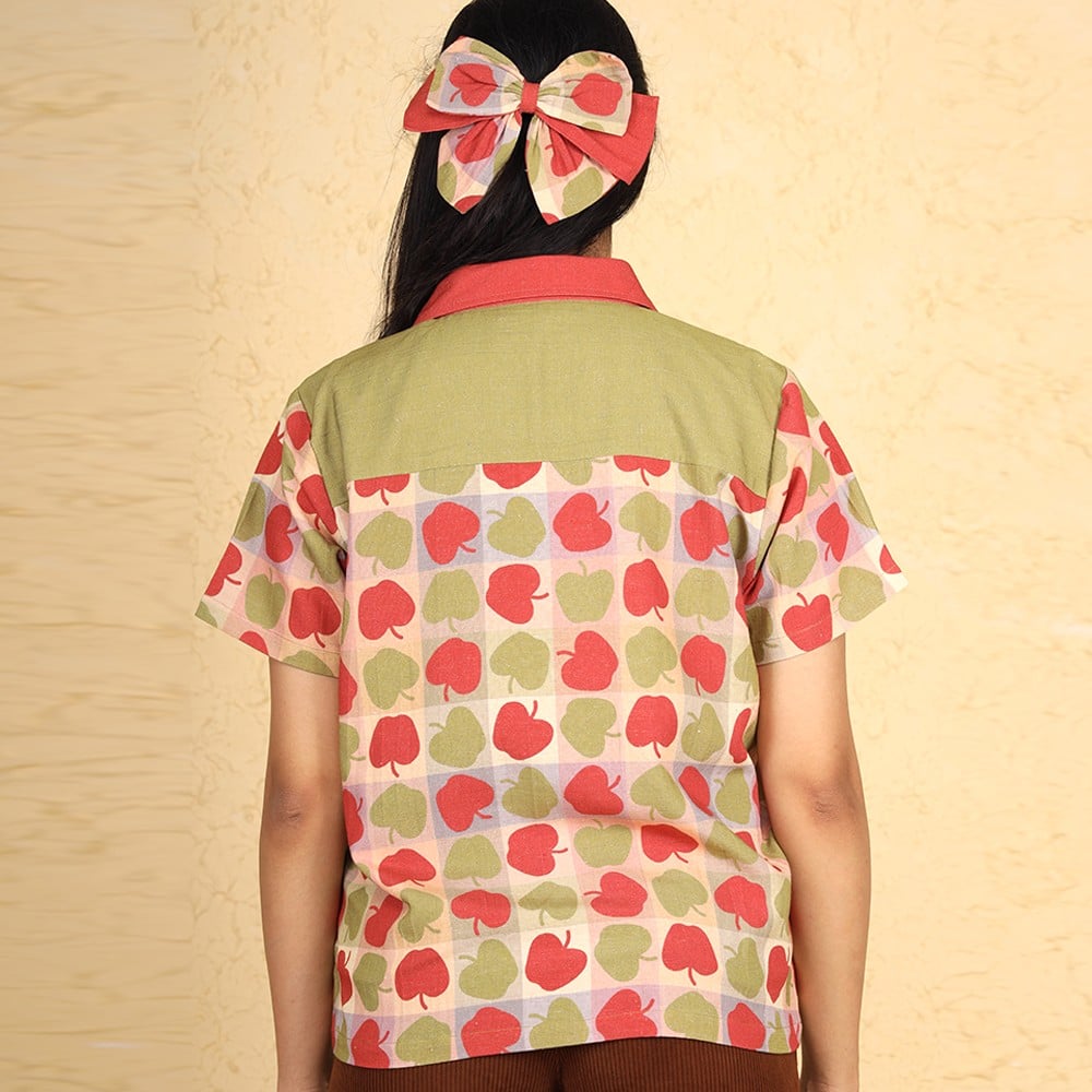 This handcrafted apple print cotton shirt is designed to bring a playful yet effortless charm to everyday styling. Featuring an all-over apple motif in warm red and green tones on a soft checkered base, it offers a fresh and eye-catching look with a touch of vintage appeal.