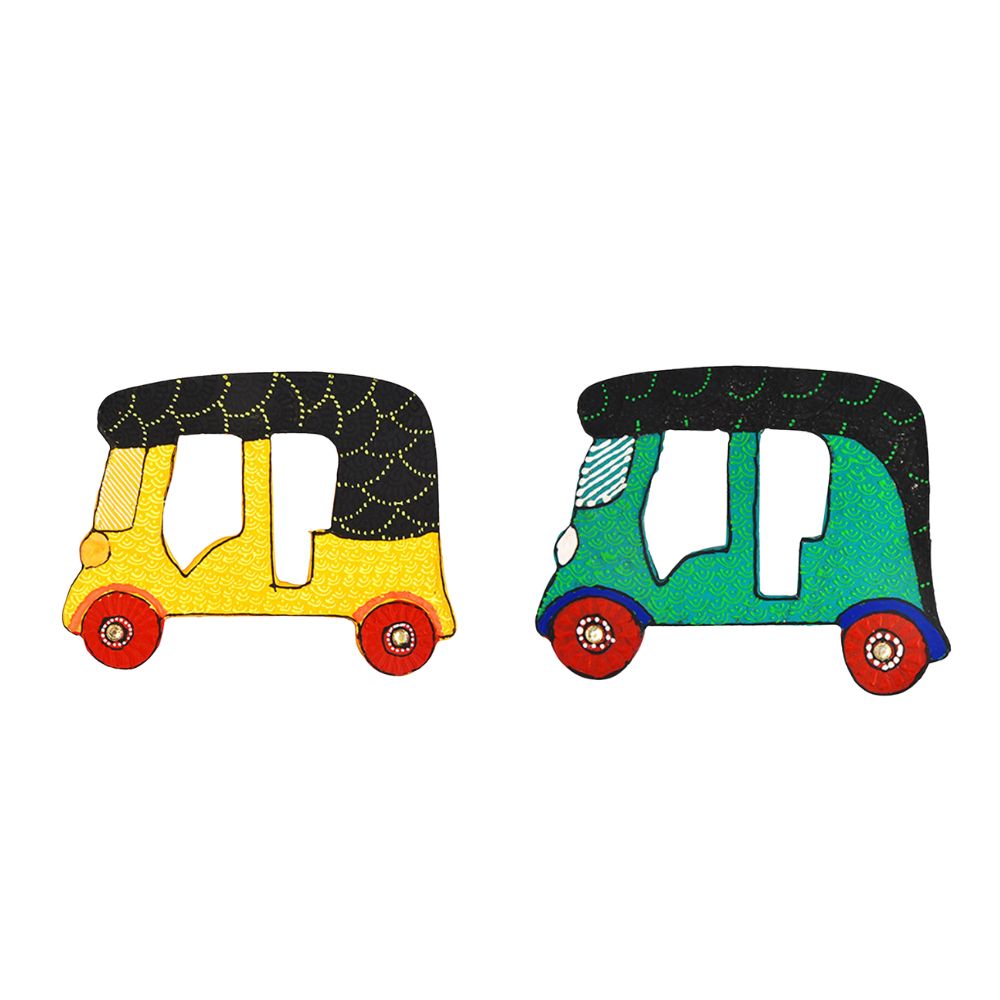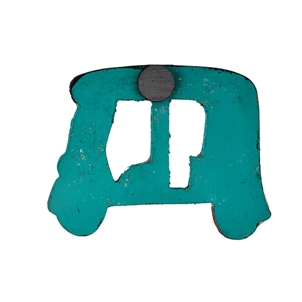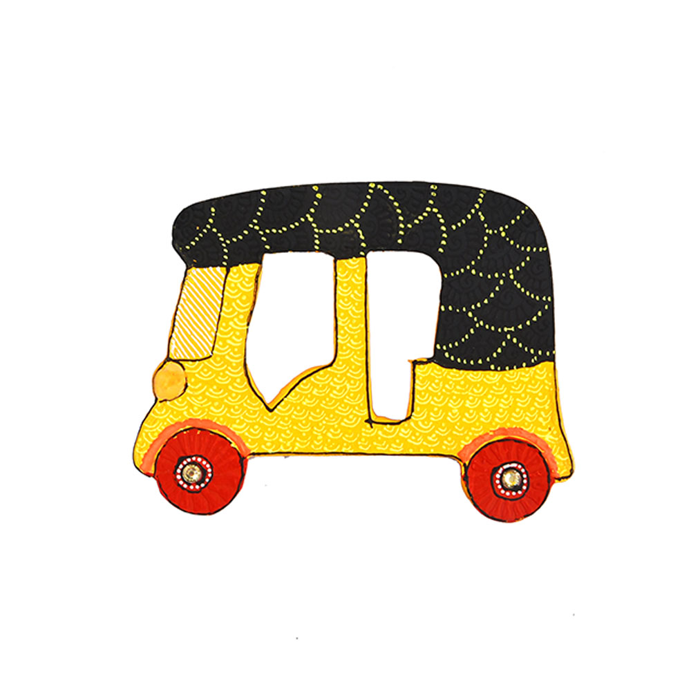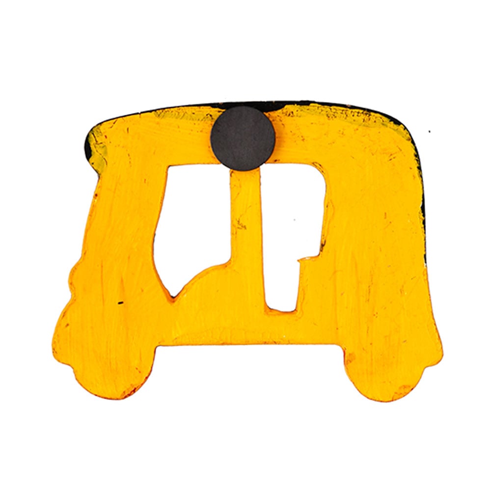 This decorative magnet reflects the familiar silhouette of an Indian auto rickshaw through hand shaped contours and detailed surface painting. Each piece carries subtle variations that highlight its artisan origin and visual individuality.
