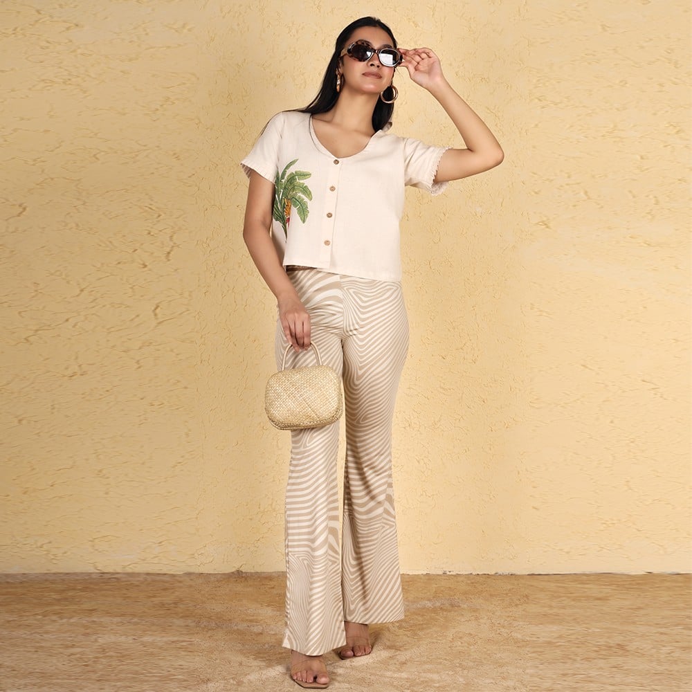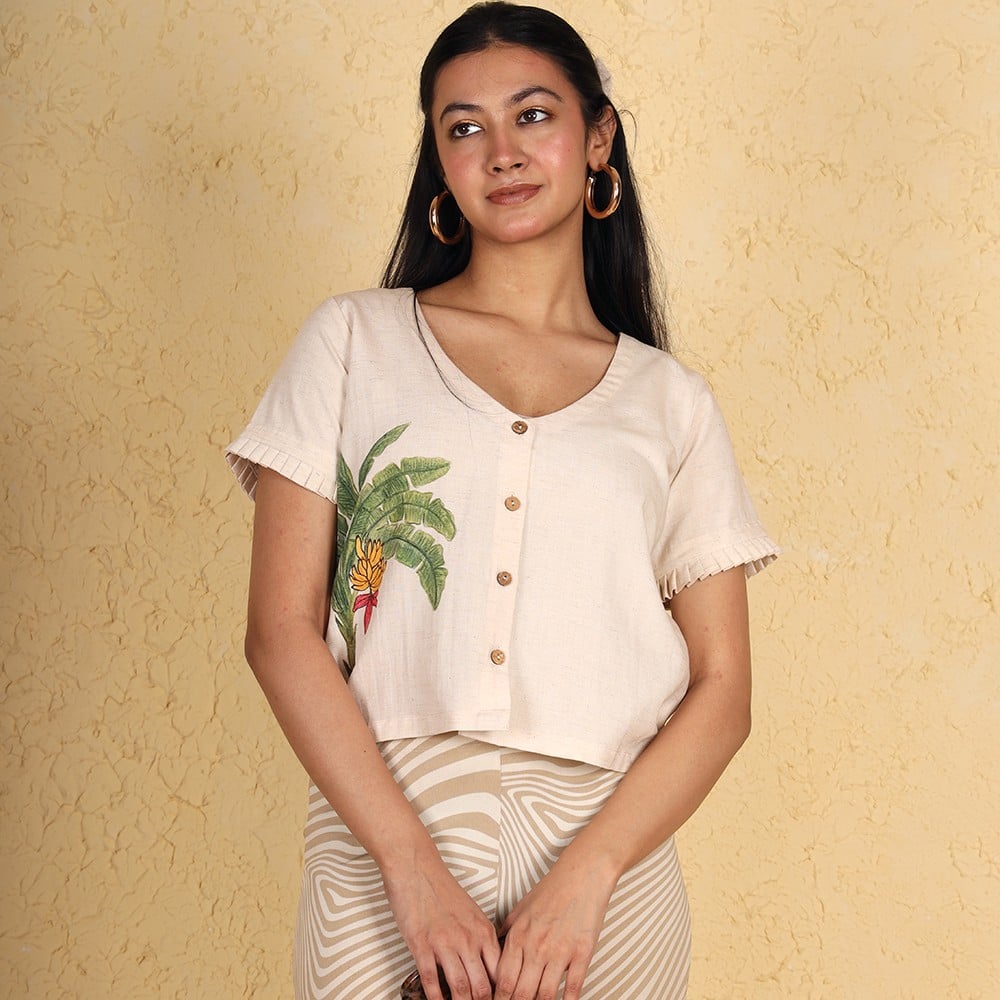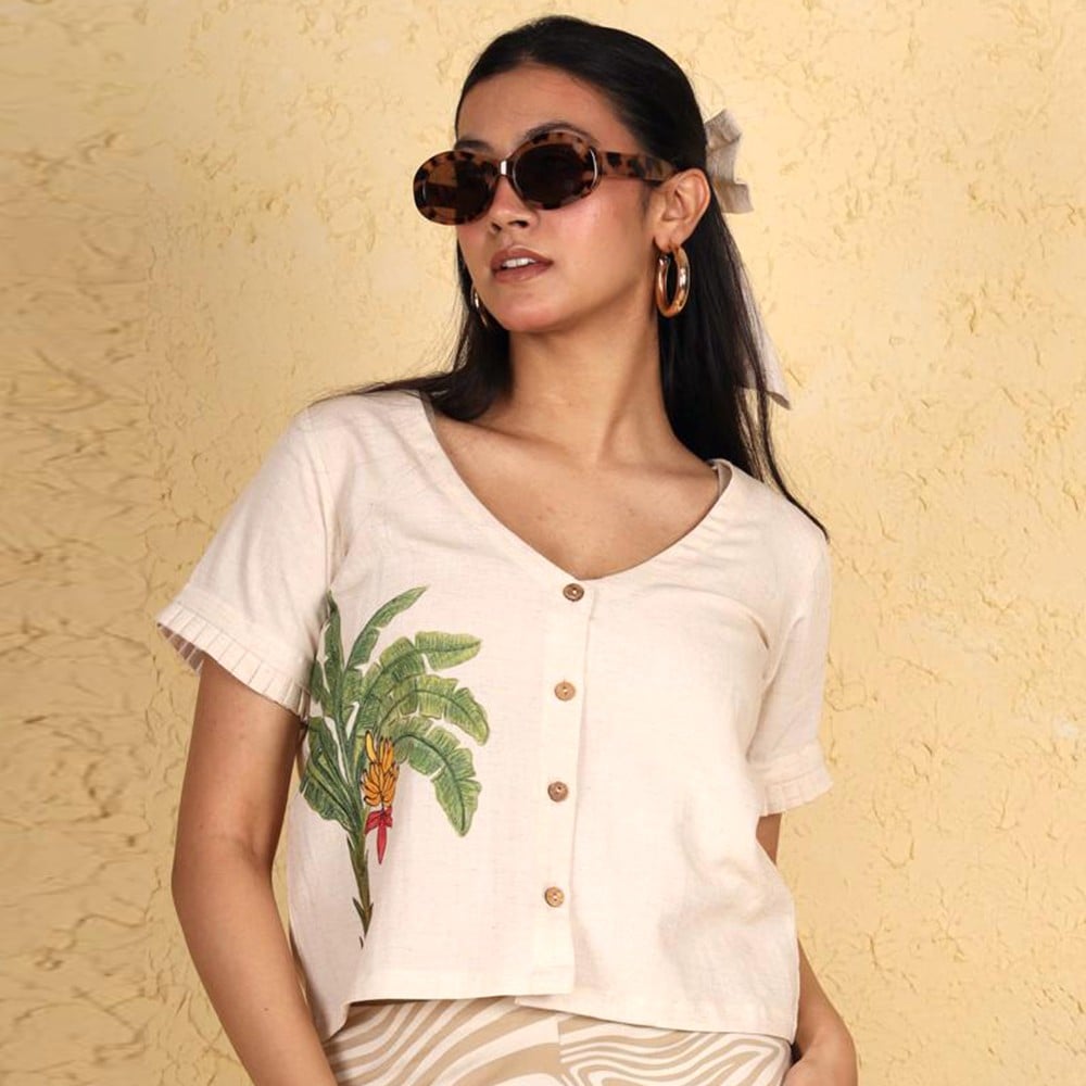 This handcrafted banana tree print cotton shirt is designed to bring a touch of tropical elegance to everyday wear. Featuring a soft neutral base with a delicate hand-drawn banana tree motif, it offers a minimal yet artistic look that stands out effortlessly.