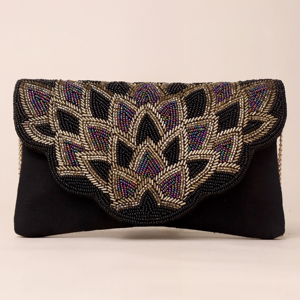 Elevate your evening ensemble with this elegant black clutch featuring intricate hand-beading in a lotus-inspired geometric design. The scalloped flap adds a regal touch, while the iridescent accents in purple and gold give it festive flair. Whether you're heading to a wedding, cocktail party, or festive gathering, this statement piece offers timeless sophistication and artisan charm.