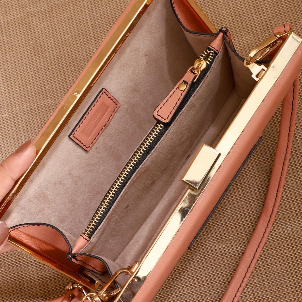 Crafted from lovely Blush leather it has a clutch clasp closure that adds a touch of vintage charm while keeping your essentials secure. Inside, a center zip divider helps organize your items, making it easy to carry your phone, makeup, and wallet. Hand held this clutch and add charms in your evening events.