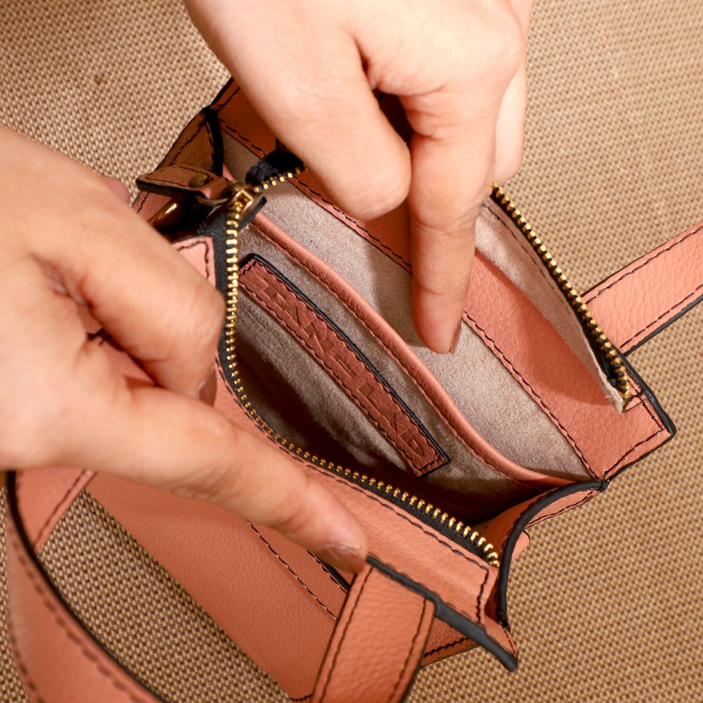 Crafted in beautiful Blush leather. Despite its petite size, this handbag doesnt skimp on features. The secure zipper closure ensures your belongings are safe, while the interior houses a zip pocket and a utility pocket. It offers enough space to carry select mobile phones, some currency, and your favourite lipstick.