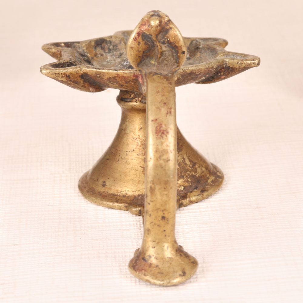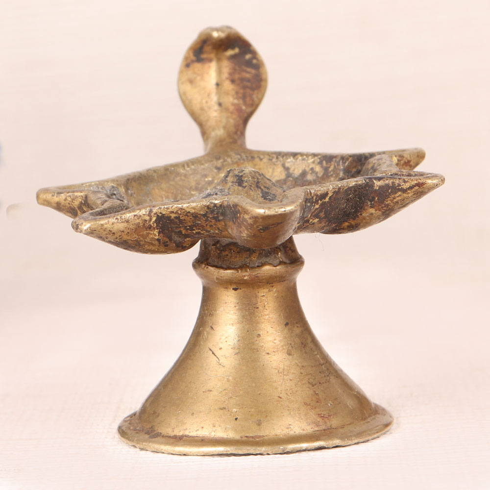 A Vintage Brass Aarti Lamp with a unique cobra handle that is meticulously handcrafted by talented Indian artisans hailing from the rich tradition of Western India. This stunning piece showcases the unparalleled craftsmanship of our artisans and is a true testament to their dedication. Crafted from high-quality brass, this lamp features an enchanting antique brown finish that adds an aura of timeless elegance to any space. Versatile in its application, it can be a cherished addition to your home, office, restaurant, hotel, shop, or cafe. This Aarti lamp is a spiritual treasure, ideal for morning and evening prayers, infusing your sacred space with a warm, inviting glow. Moreover, it serves as a captivating decorative item, perfect for vintage collectors and for display at exhibitions. With the capacity to hold five jyots, it allows you to illuminate your surroundings with the radiant flicker of mustard oil or ghee-lit cotton wicks, creating an ambiance of serenity and devotion. Celebrate special, festive, or auspicious occasions by gifting this remarkable Vintage Brass Aarti Lamp to your loved ones.