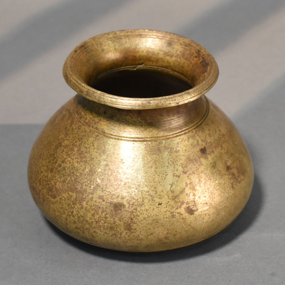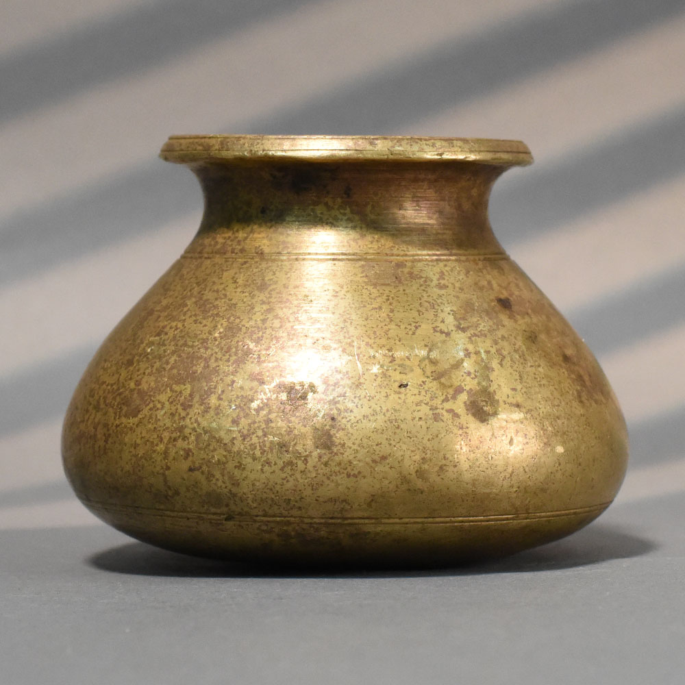 This handcrafted brass aged finish traditional ritual pot is a beautifully simple yet character-rich piece that reflects the authenticity of traditional Indian metal craftsmanship. With its rounded body, wide flared rim, and low-profile base, the form emphasizes balance, functionality, and timeless appeal. The surface features a naturally aged patina, with subtle speckling and tonal variations that give the pot a distinctive vintage character. These marks are a result of both the handcrafted process and natural aging, making each piece unique and full of history. The understated design allows the texture and finish to become the focal point. Made from solid brass, the pot is durable and versatile, suitable for everyday ritual use as well as decorative purposes. The wide mouth makes it easy to fill and use for holding water, flowers, or sacred offerings. Its stable base ensures secure placement during use in spiritual or ceremonial settings. Traditionally used in pooja rituals, temple practices, and festive ceremonies, this vessel also serves as a warm and earthy decor element. Its minimal design allows it to blend seamlessly into both traditional and contemporary interiors, adding depth and cultural authenticity. Ideal for collectors and those who appreciate handcrafted heritage objects, this brass pot brings together simplicity, function, and timeless craftsmanship in one elegant form.