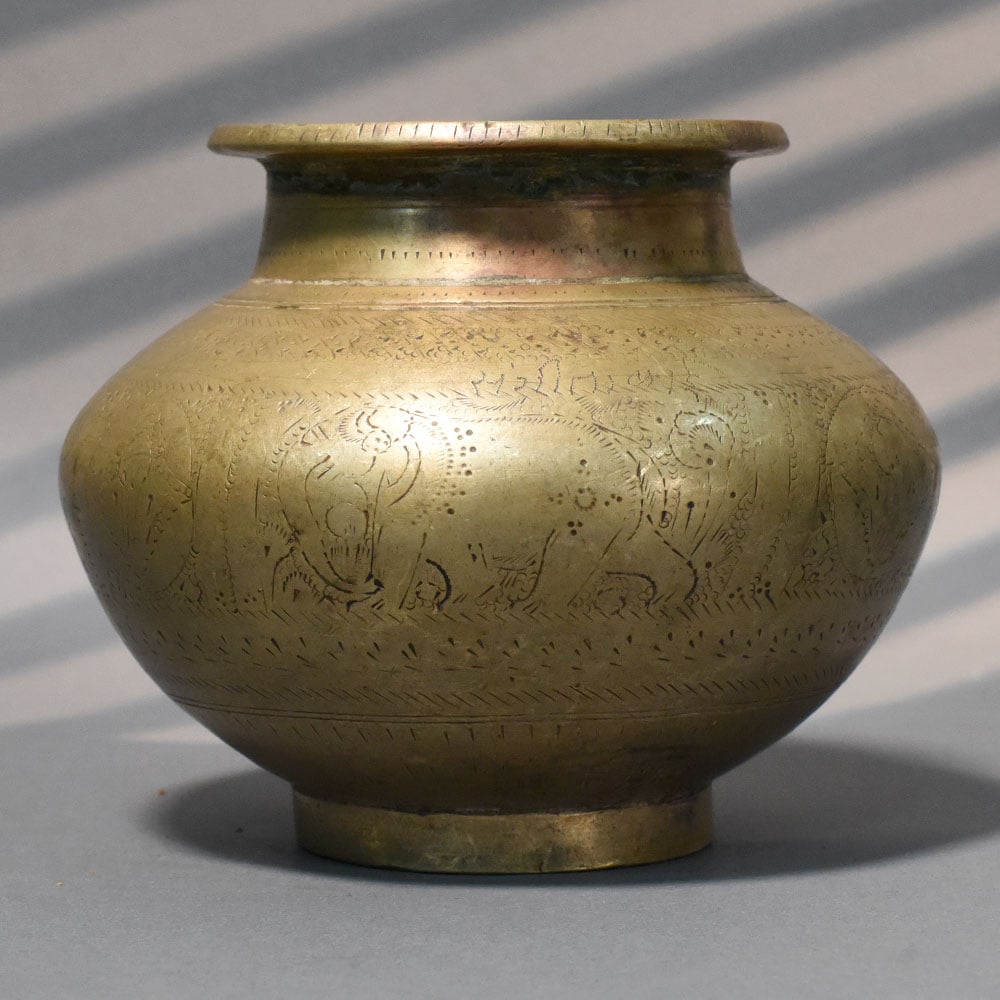 This handcrafted brass animal engraved kalash traditional vessel features detailed etching that brings storytelling into a classic ritual form. The rounded body is adorned with engraved animal motifs, adding depth, symbolism, and a distinctive artisanal character. Crafted from solid brass, the surface carries a naturally aged patina that enhances the visibility of the engraved patterns. The wide neck and flat rim provide ease of handling, while the balanced base ensures stability during ritual use. Traditionally used in pooja ceremonies, sacred water storage, and religious offerings, this kalash holds cultural and spiritual importance. The engraved animal motifs often symbolize strength, protection, and connection to nature, making the vessel both functional and meaningful. Beyond rituals, the kalash serves as a decorative heritage piece, suitable for traditional interiors or as a statement accent in contemporary spaces. The intricate detailing adds visual richness without overpowering the form. Ideal for spiritual use, gifting, or collectors of handcrafted metalware, this brass kalash combines craftsmanship, symbolism, and timeless utility.