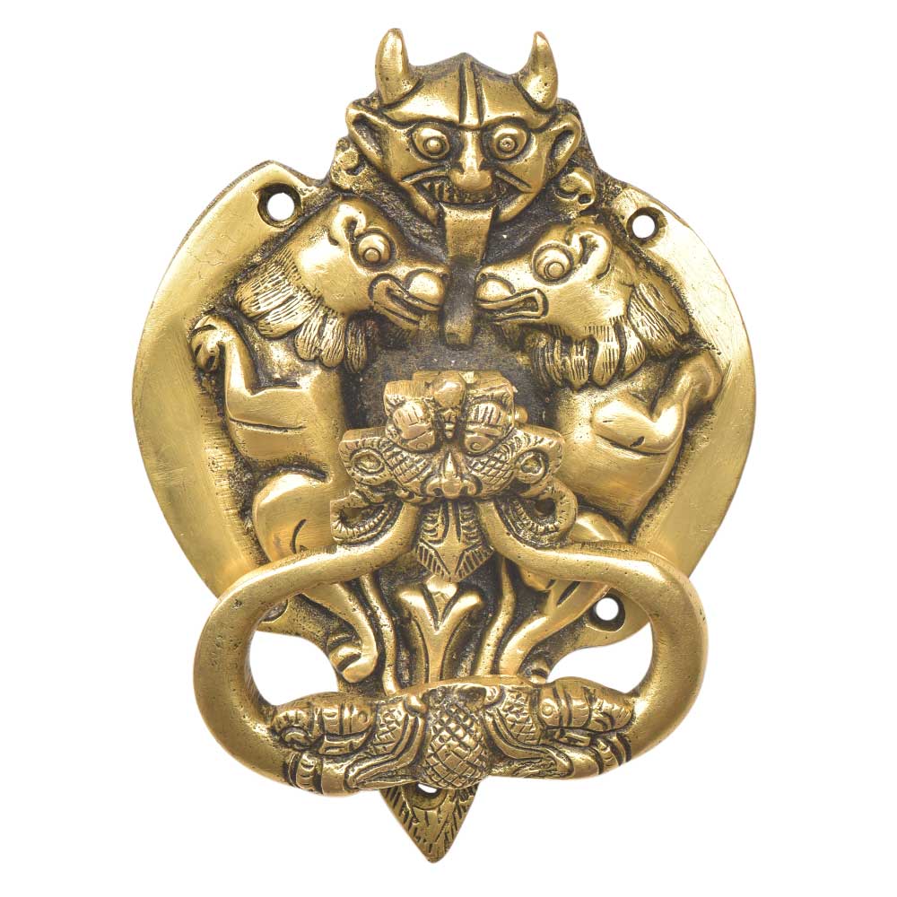 A very solid looking brass door knocker made by expert artisans with the demon face on the top with two Lions on both the sides and the door knocker attached to the dragon face in the centre of door knocker on a broad strike plate. Elegant home decor product.